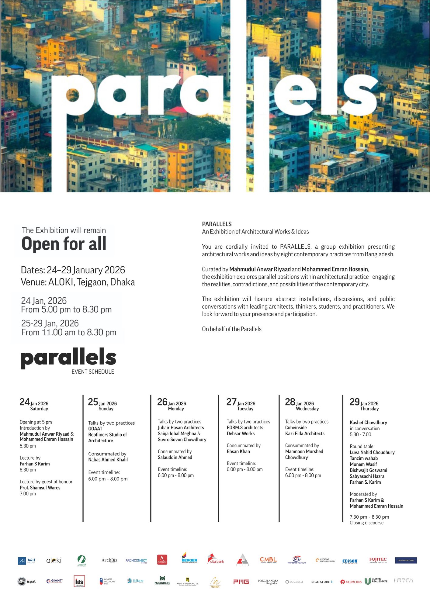 “Parallels” is a week-long exhibition, lecture, and discussion series exploring contemporary architectural practice in Bangladesh. Each participating practice offers a self-portrait of its ideas, processes, and projects, together forming a broader picture of Dhaka’s architectural landscape—shaped by shared contexts yet distinguished by unique professional trajectories.