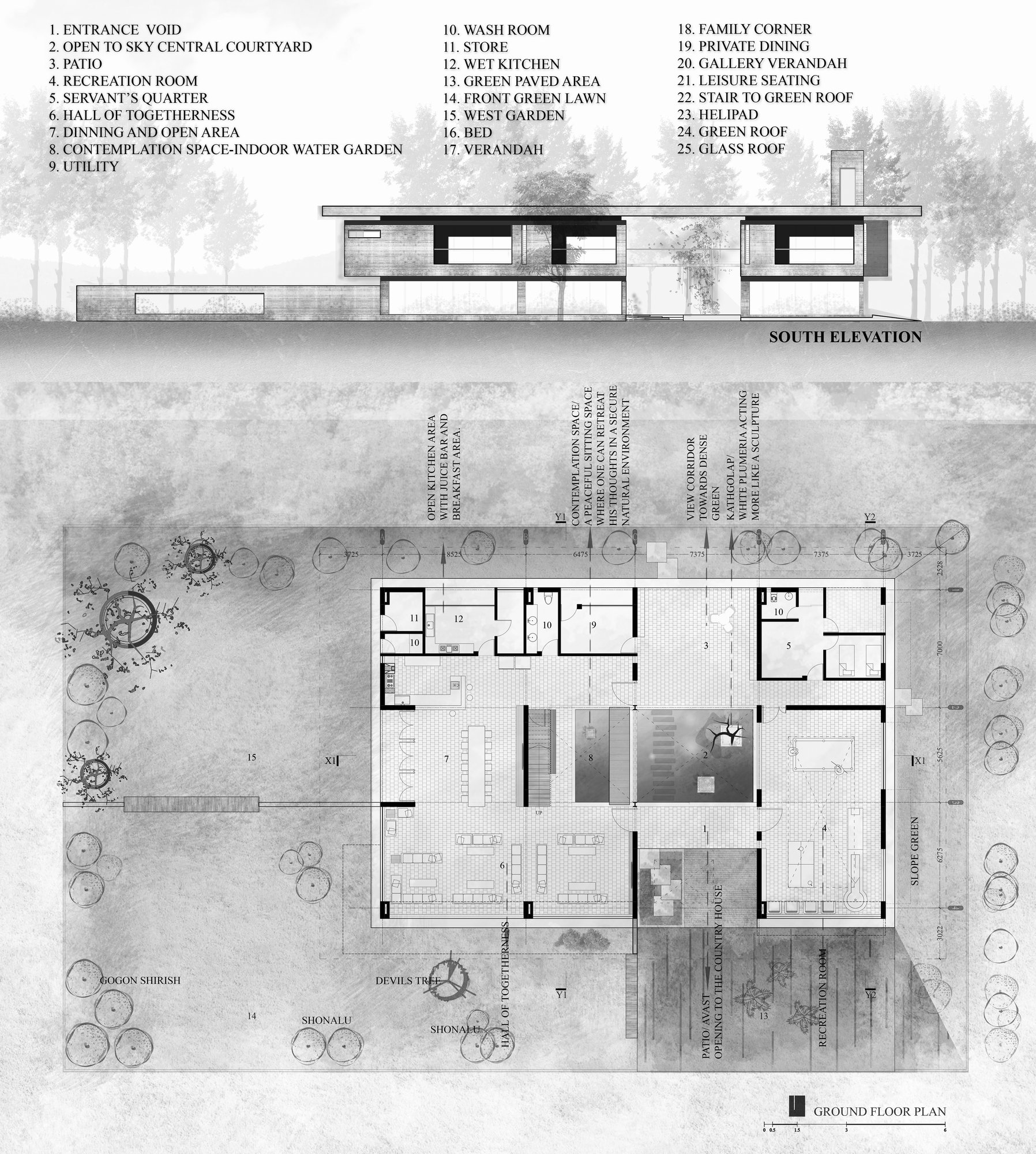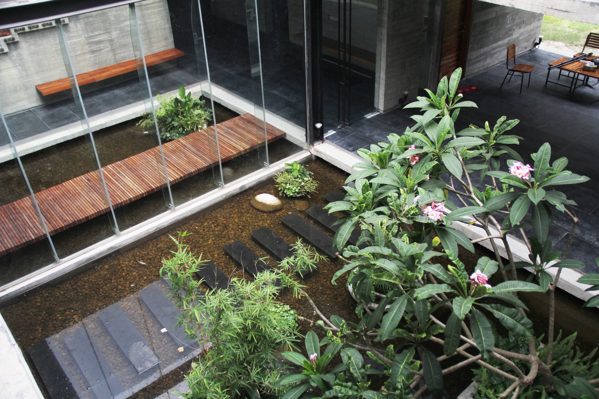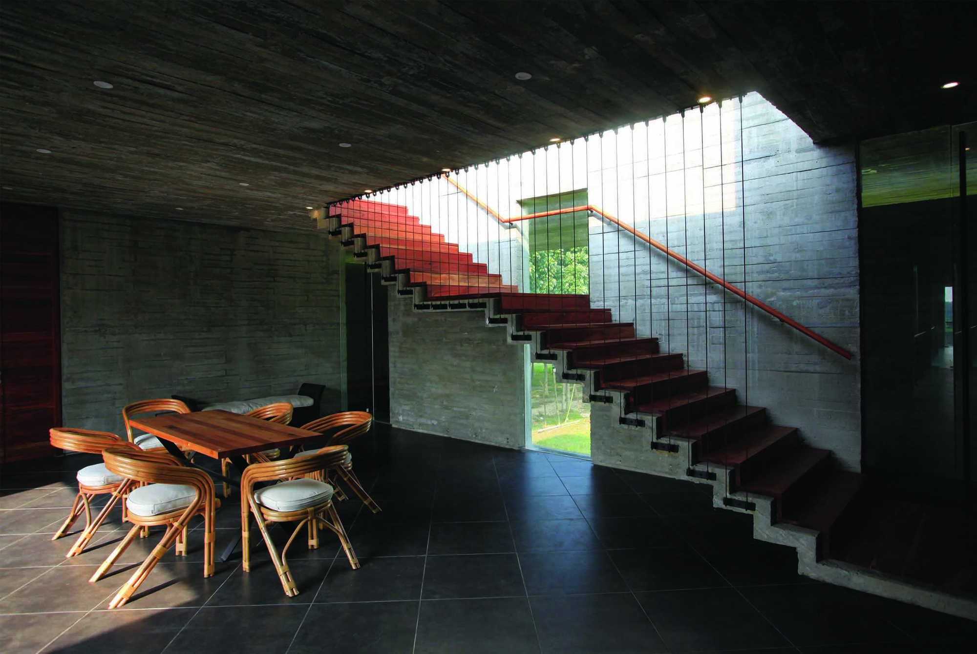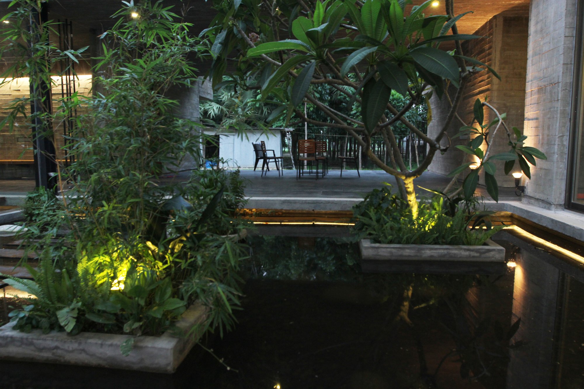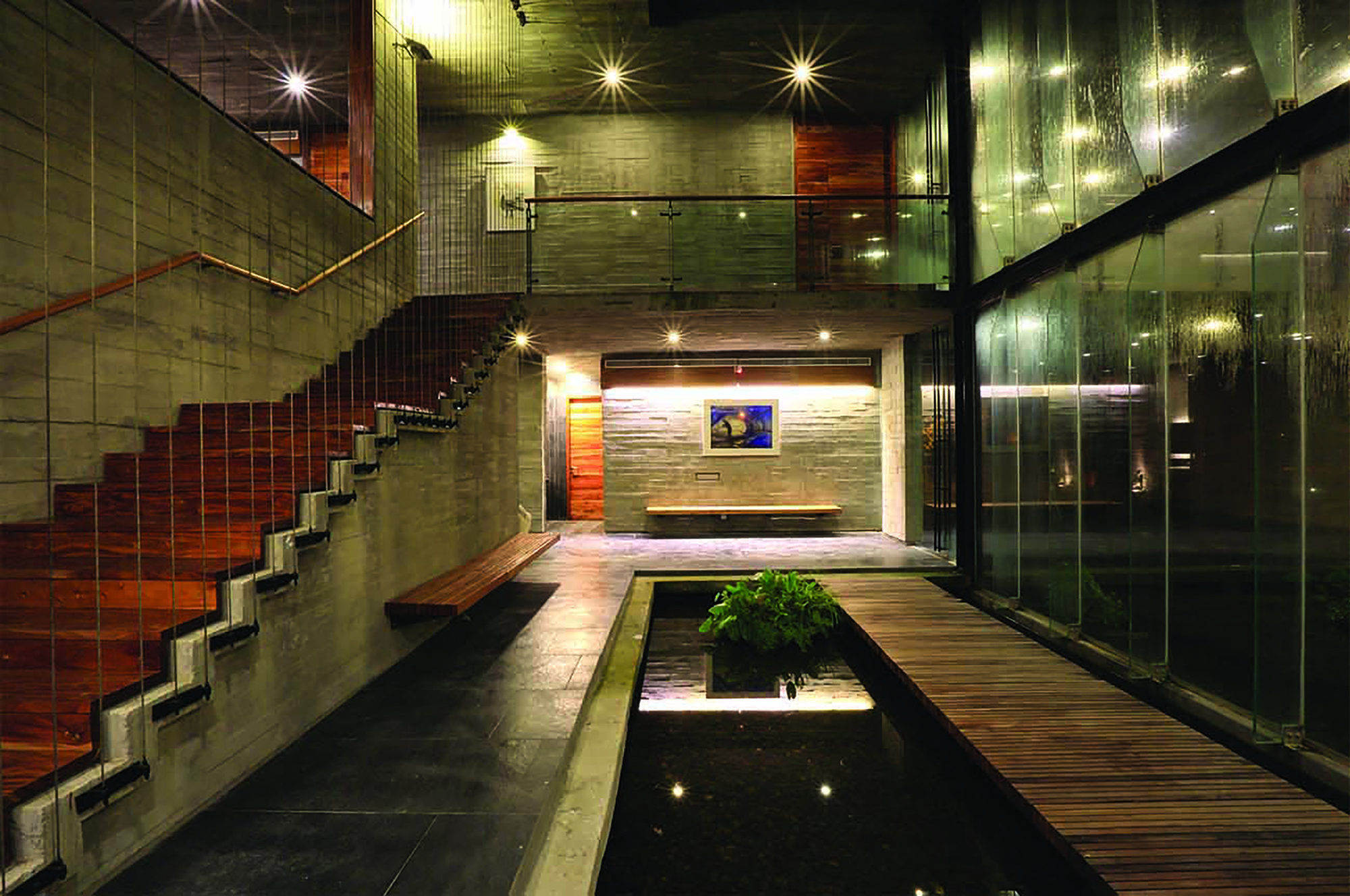 In the center there is a courtyard which is accessible from both the main approach and the back garden. It is an AMBIGUOUS PLACE where all the major spaces and levels of the home meet and where light penetrates from different angles all the day and even during the full moon which enliven the major interior spaces. The water container containing greeneries, stones, water, fishes symbolizes the PRESENCE OF LIFE in the whole house. The CHANGING MOOD of the interior spaces was imagined as one of the prior concern of the house.