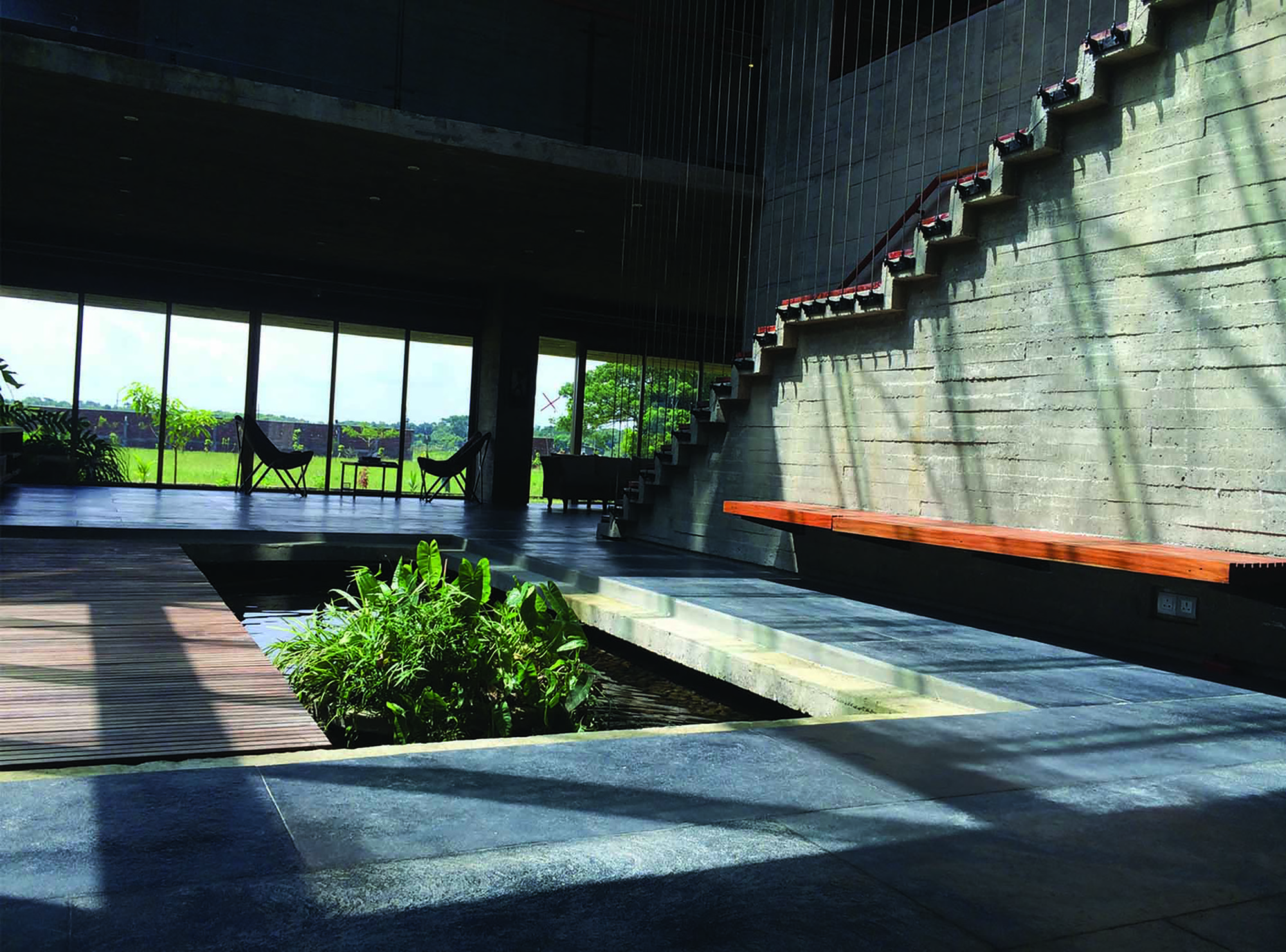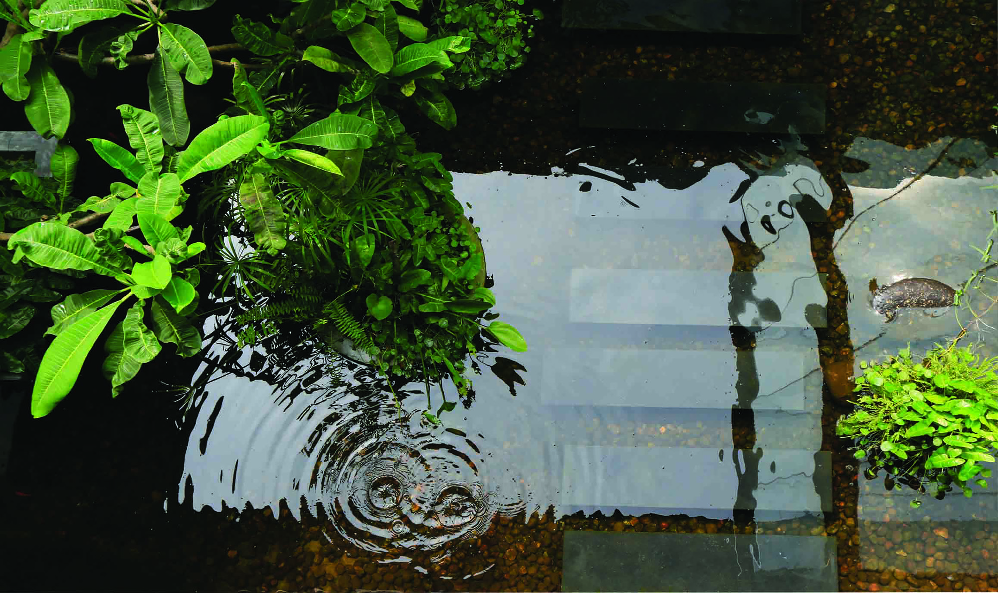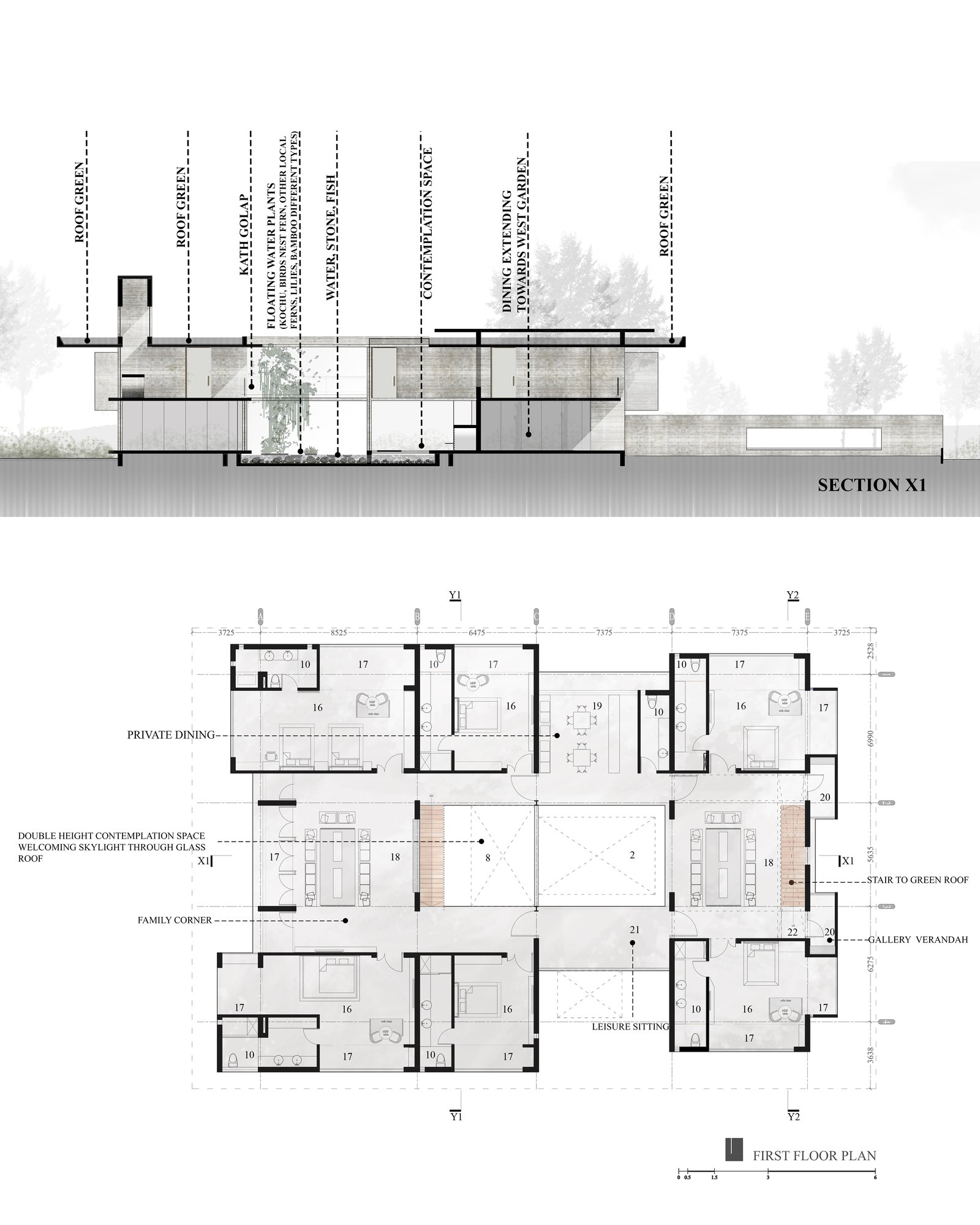 The entrance void leads towards the CENTRAL COURTYARD that contains a reflection pool with pebbles, local water-plants, sunken steps and fish. Heading straight, the eyesight goes beyond the building premise into the DENSE WOODS behind, uninterrupted. Also, beside the central courtyard, the reflection pool flows into the interior to create the PLACE OF CONTEMPLATION. You can sit here for hours and you won’t know the time passing by. Even if it is an enclosed and controlled environment, you shall always feel the outdoor and the nature in here.