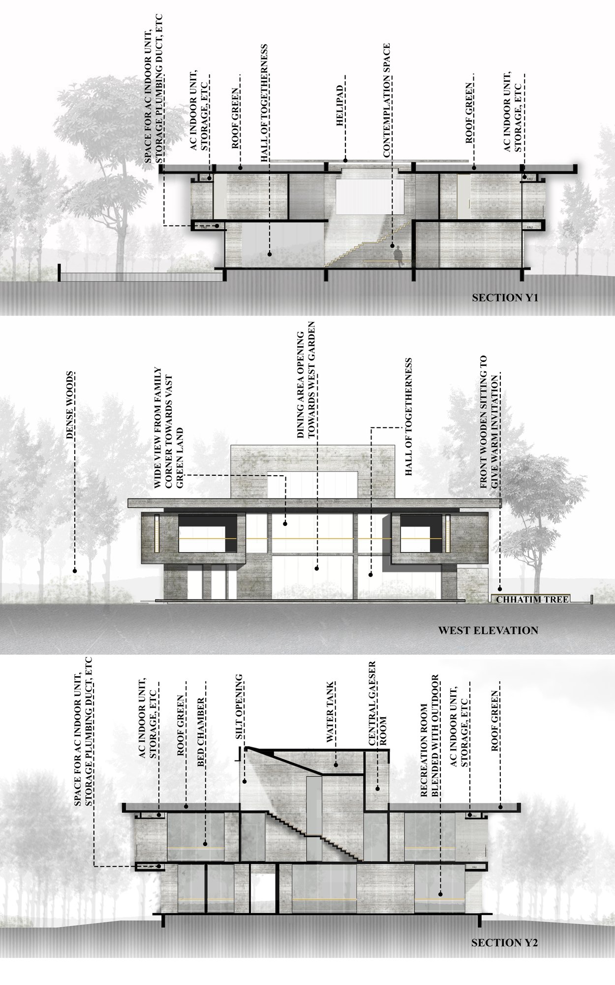 ROUGH WOODEN TEXTURED CONCRETE is selected as the primary material for its expected positive ageing characteristic. It blends with the earth as well as complements with the green surroundings. The sun plays over the rough texture whole day and creates lively exterior and interior spaces. Low maintenance is also a factor for choosing the material. Singularity is expected to be achieved by the use of concrete as floor, as walls and finally roof.
