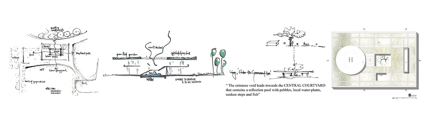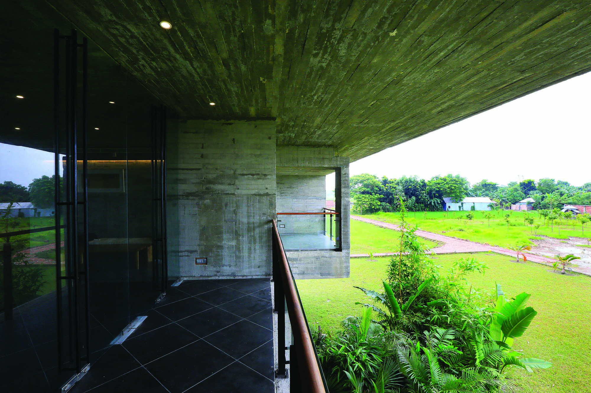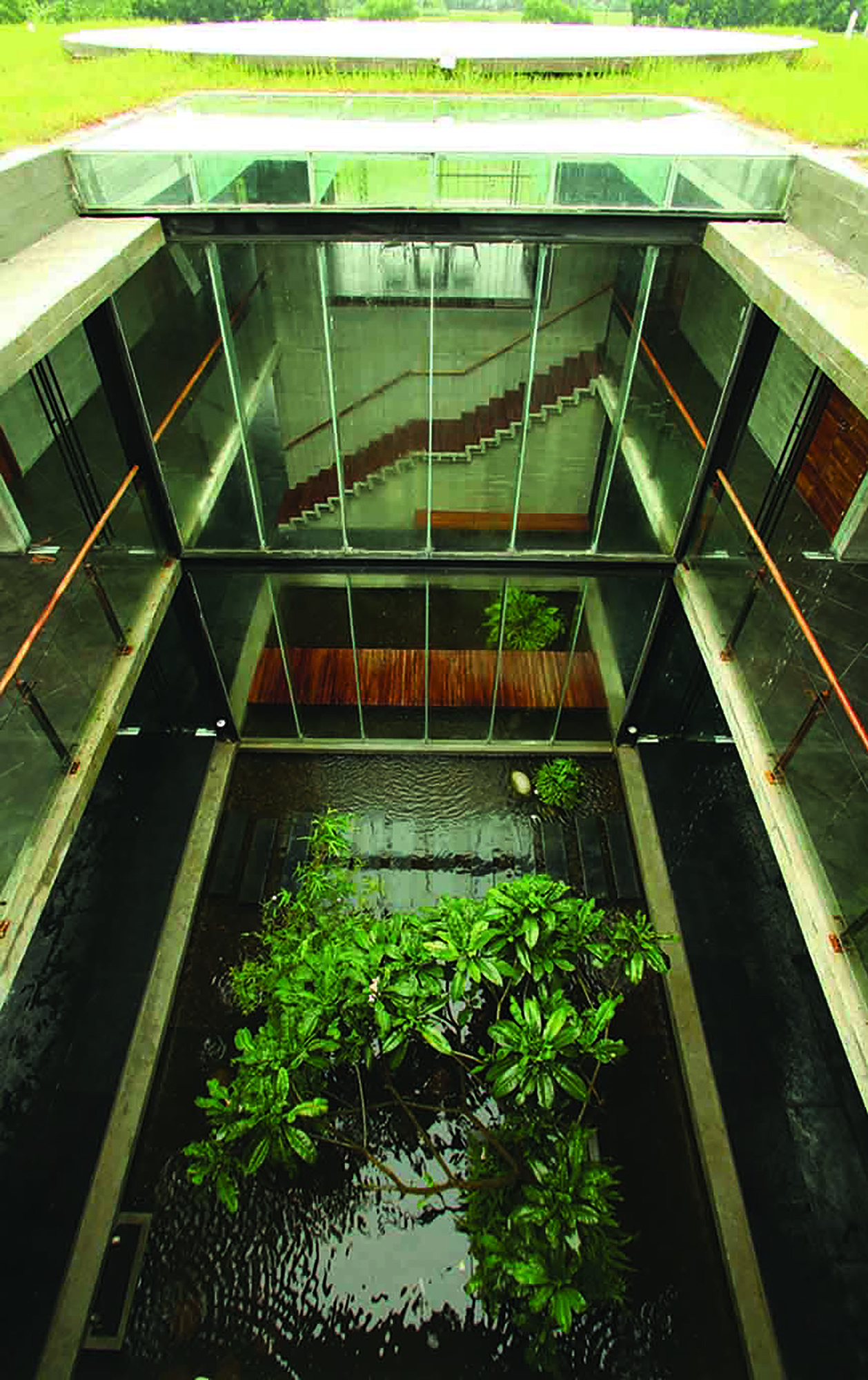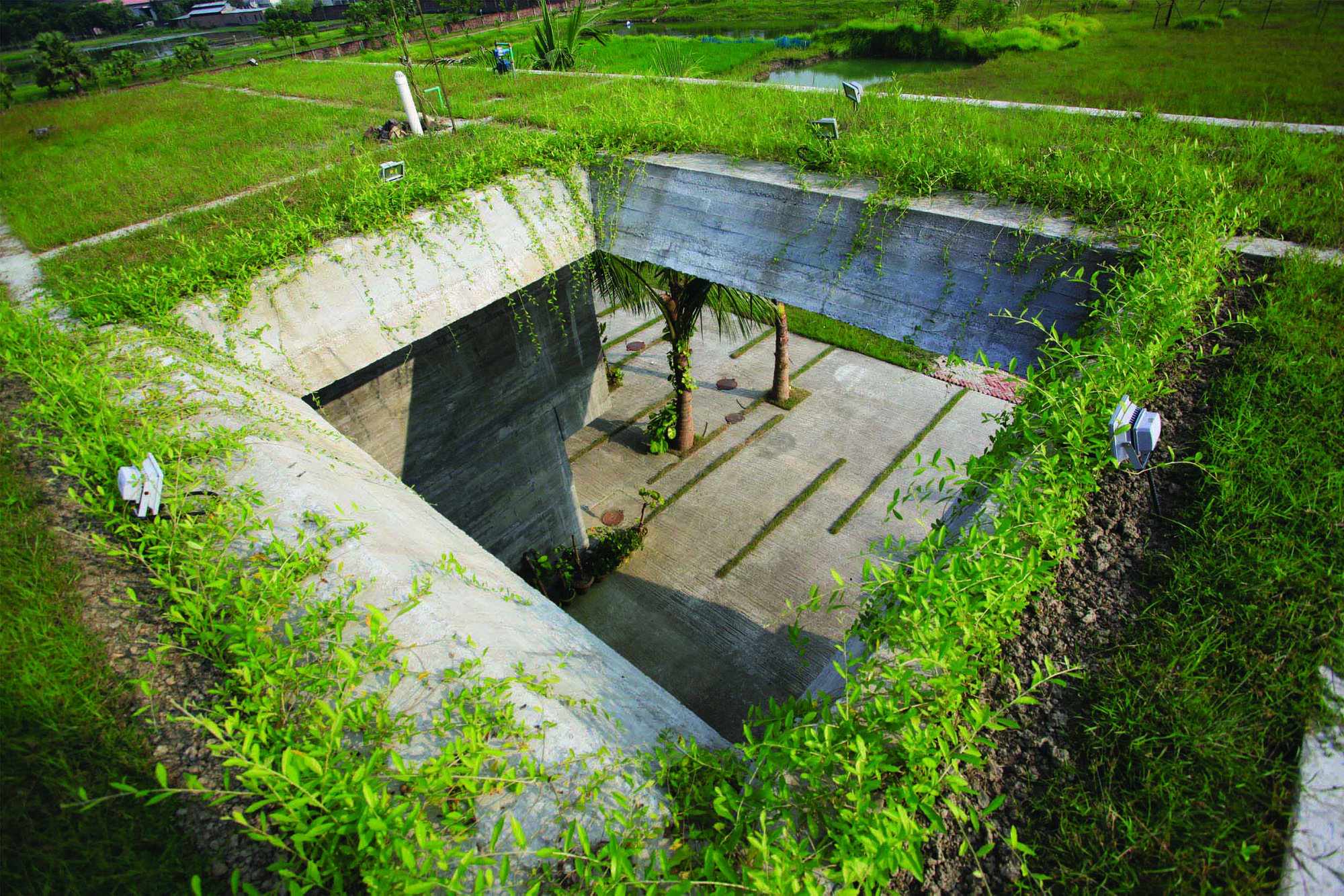 The PARASOL ROOF acts as an insulator for the whole building. The masters who practiced in our country like STANLEY TIGERMAN, CONSTANTINOS DOXIADIS, ROBERT BUI, MUZHARUL ISLAM found the parasol roof to be the most suitable archetype for warm-humid climate. The cooling effect of parasol enhanced by deep and extensive roof gardening. The grass, creepers and any form of vegetation in the lawn and also in the roof level were chosen and taken from the surrounding ground. Therefore, when you look behind the horizon, you see only thin lines of built structure swimming through the GREEN. The ground has been merged and lifted in such a way that it feels like a camouflage.