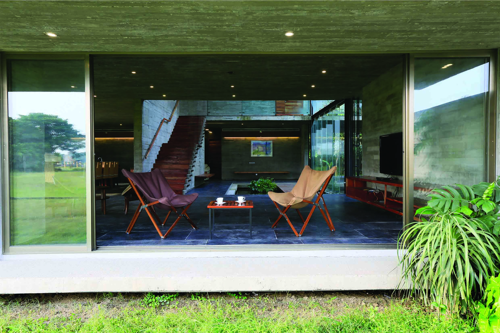 The building has been built with prominently one single material in a word. To create an ACHROMATIC MARK in the abundant green was the intention. Therefore, only grey wood-shuttered concrete has been used as primary material in building the house to match the color of earth, the texture of surroundings and to celebrate sunlight & colors of seasons and nature.