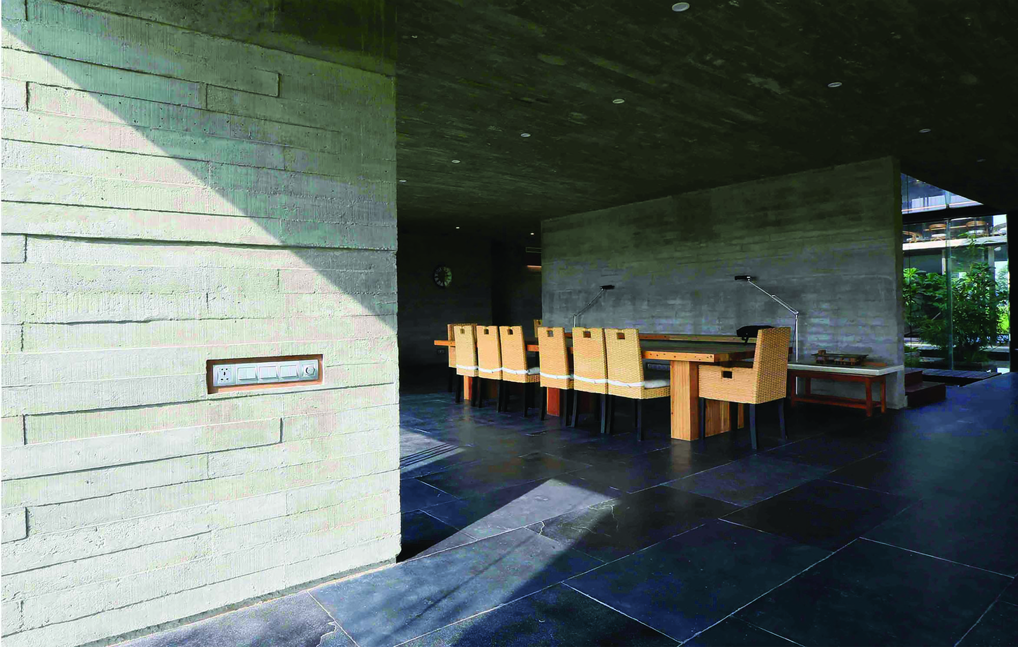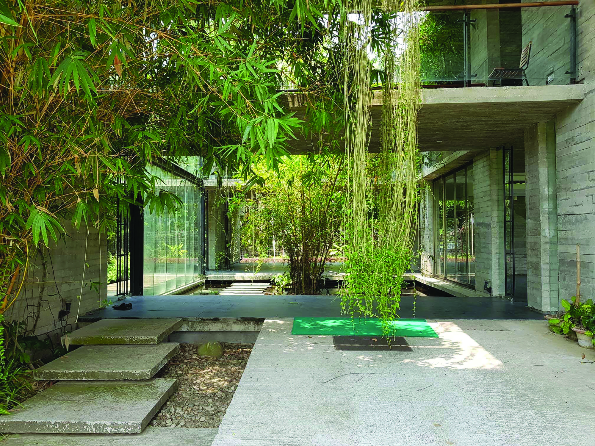 Each space is provided with cross ventilation and ample natural light. Even the roof is designed as a garden that again merges with the surrounding greenery. It’s like living in AGARDEN WITHIN A LARGE GARDEN. The wide projected garden roof is one of the most important single elements in the monsoon climate, giving protection from the burning sun and torrential rain.