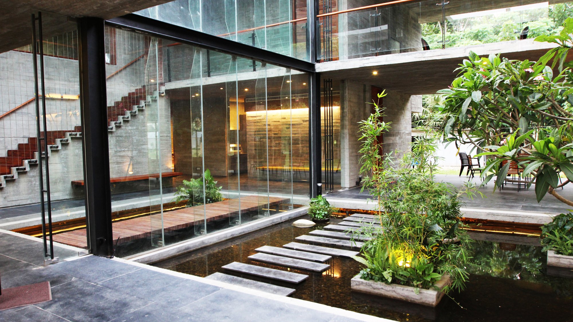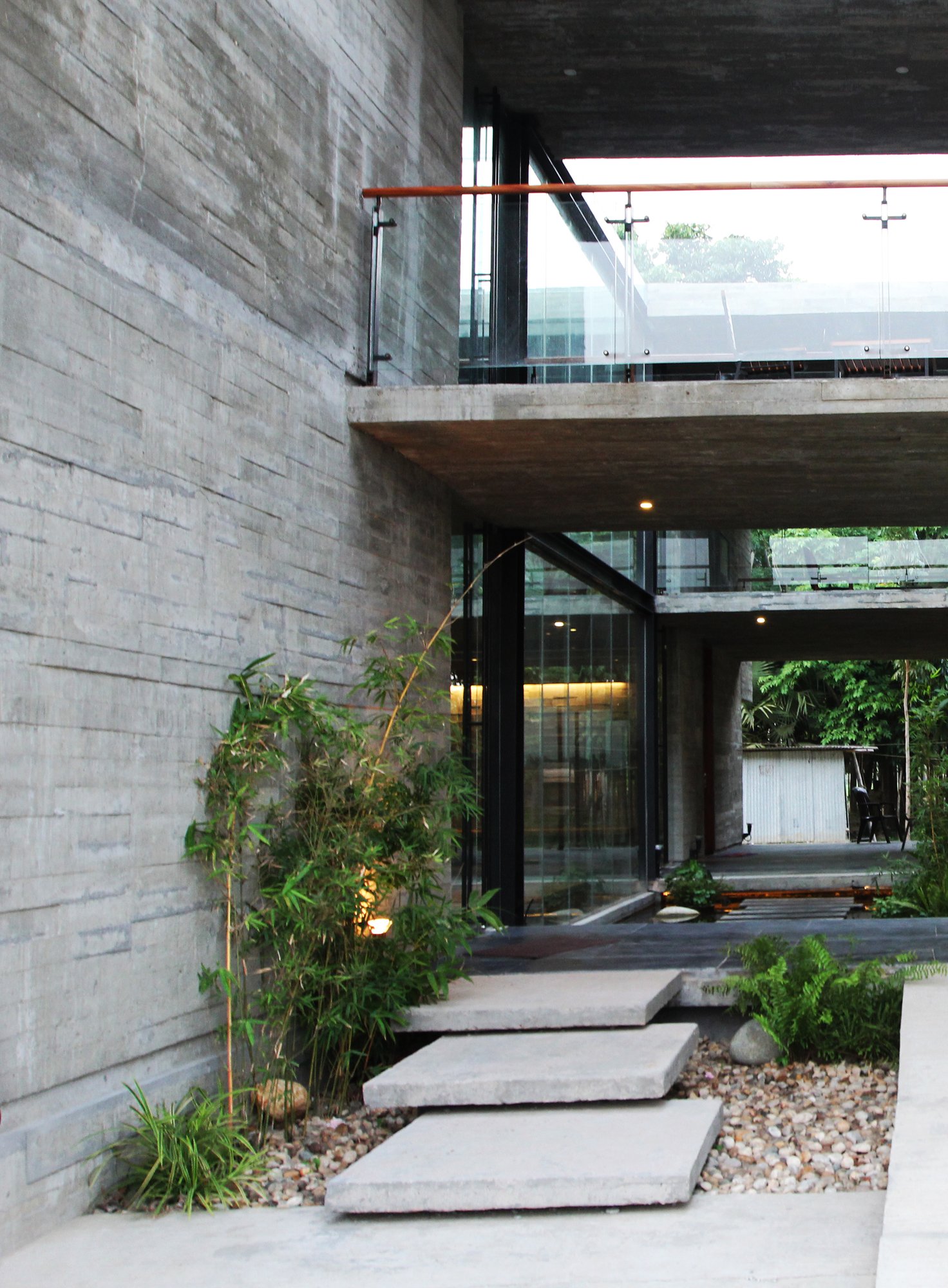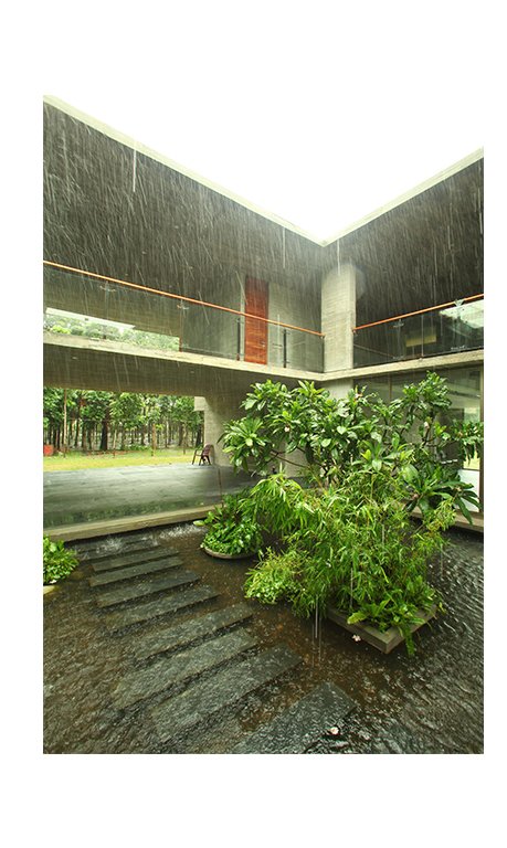 Here the architecture will play ALL THE SENSES _ the smell of earth after rain, the sound of birds and the wind in the trees, the texture of the earth and concrete, the transparency of the glass, even the taste of the monsoon rain. The color of the brown (wood) is also present here and there in subtle amount. The grey, the brown and the black all the neutral colors of construction matches and also complements the color of greenery and the color of seasons.