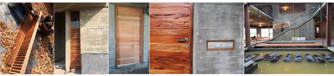 Locally available MAHOGONY wood has been used for the whole project. It has been selected for its availability and striking natural warm color as a complementary insertion in the grey concrete ambience. Also, factory-used packing wood has been used to minimize the wastage.