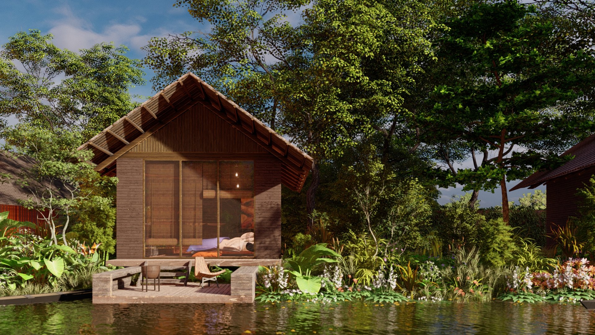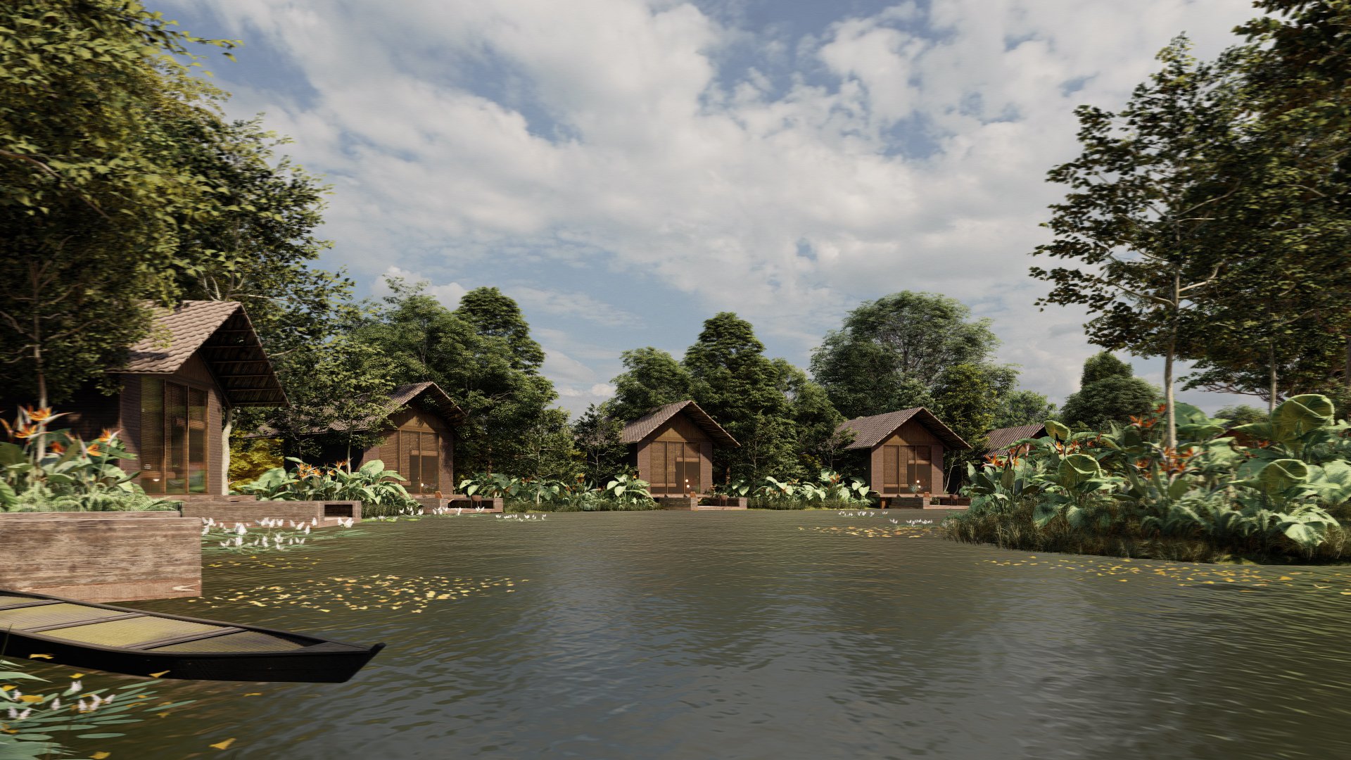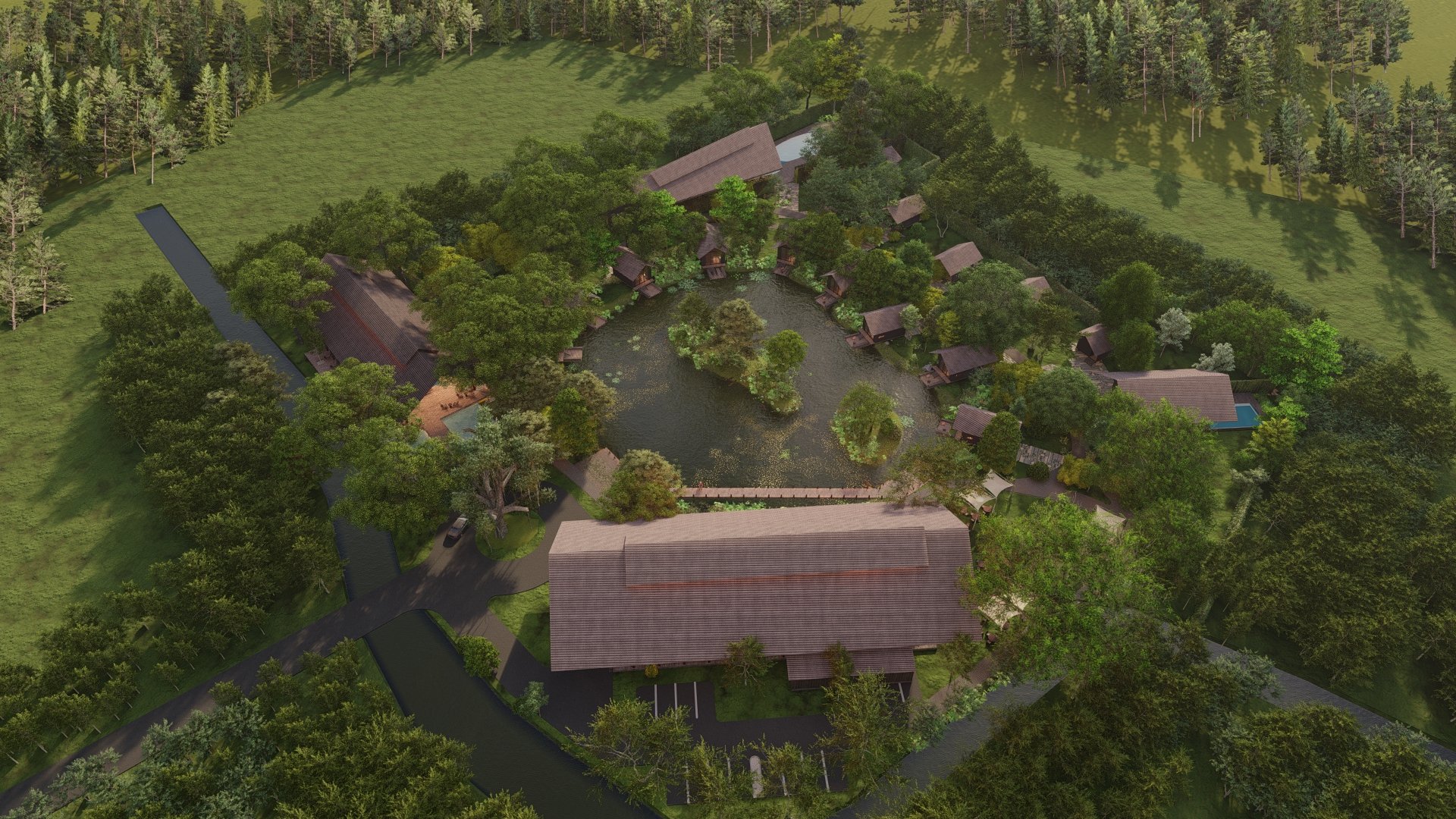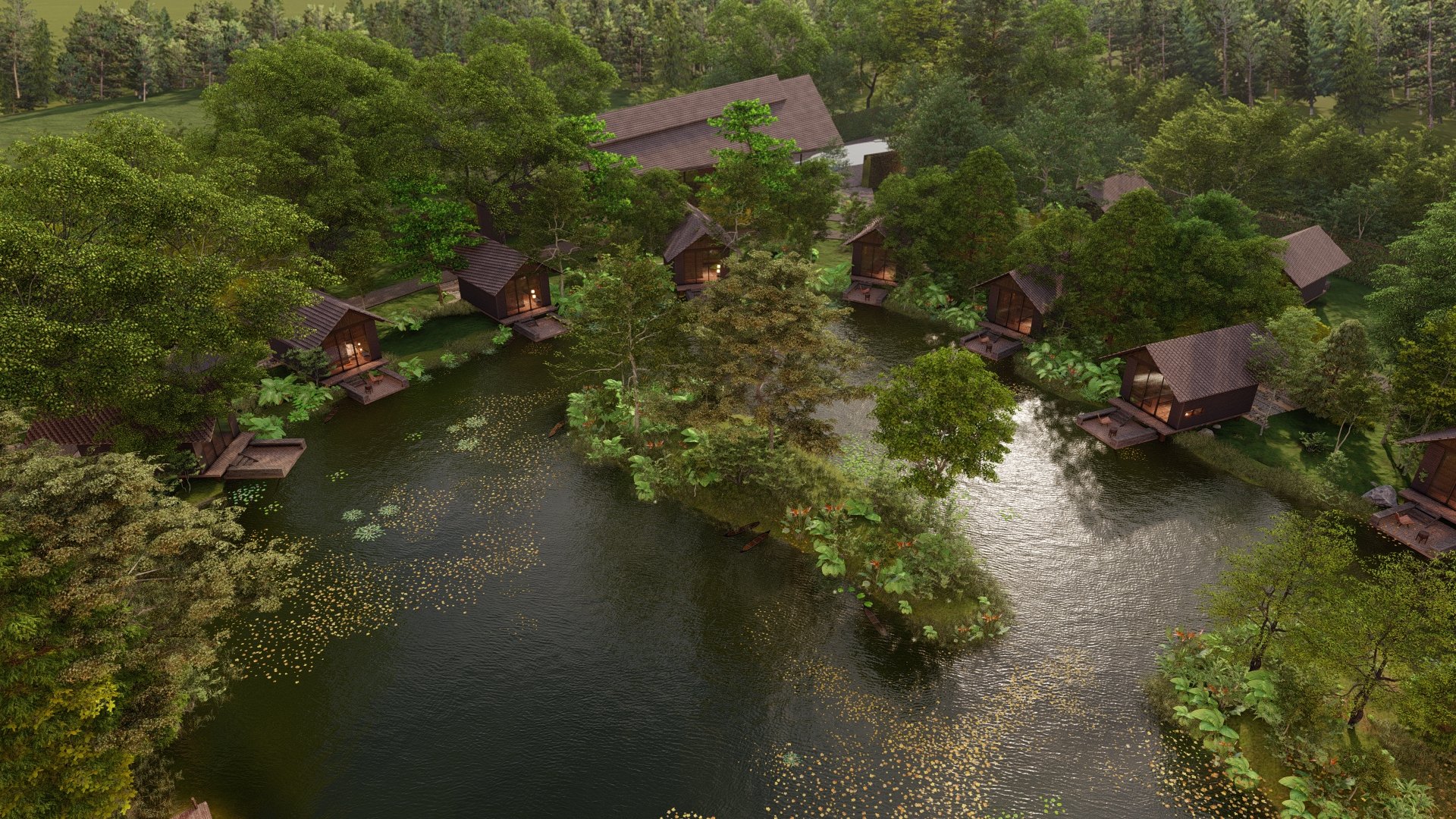 The cottages appear to rest lightly within the landscape, allowing the terrain and vegetation to flow naturally around them. Their pitched roofs and simple, vernacular forms suggest a warm, intimate retreat experience structures designed not to dominate the environment but to coexist with it. Clustered along the gently curving edge of the lake, the cottages offer uninterrupted views of the water, with trees scattered organically between them to provide shade, privacy, and a sense of immersion in nature. These cottages form a peaceful refuge where guests can enjoy the calm of the water, the rustling of trees, and the embrace of nature.