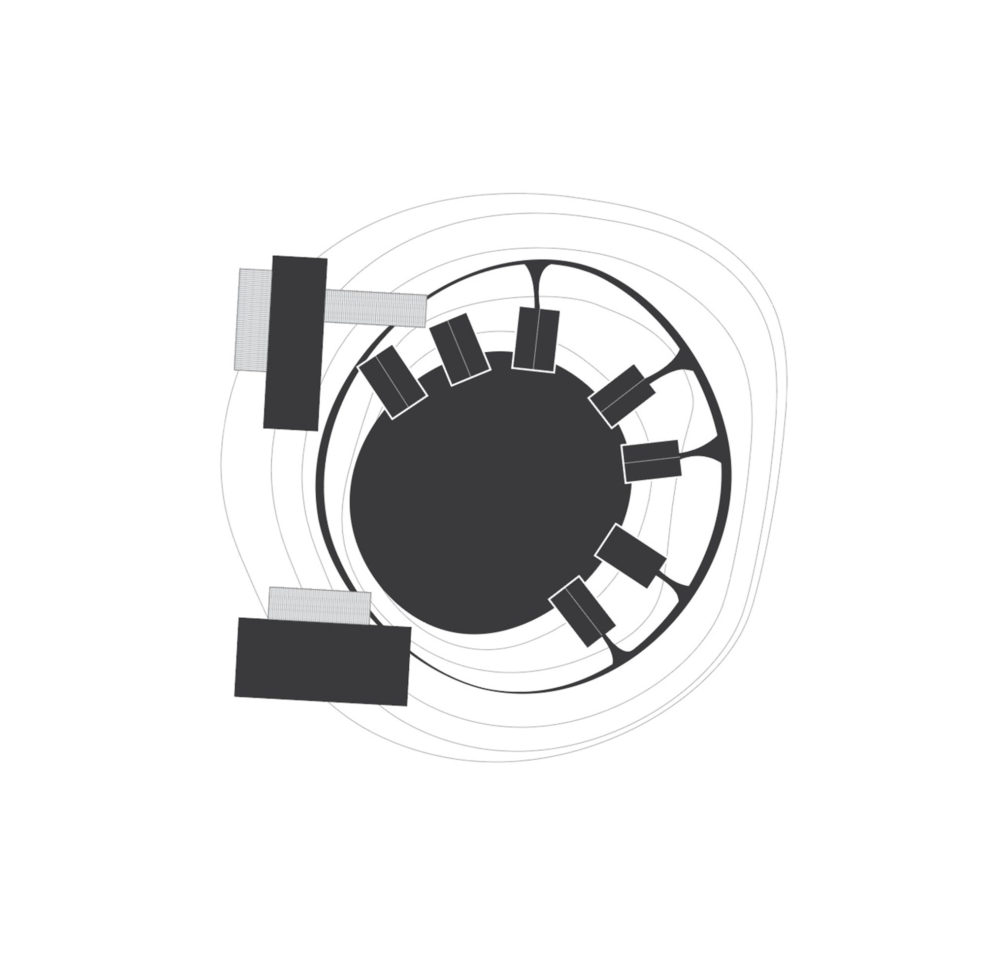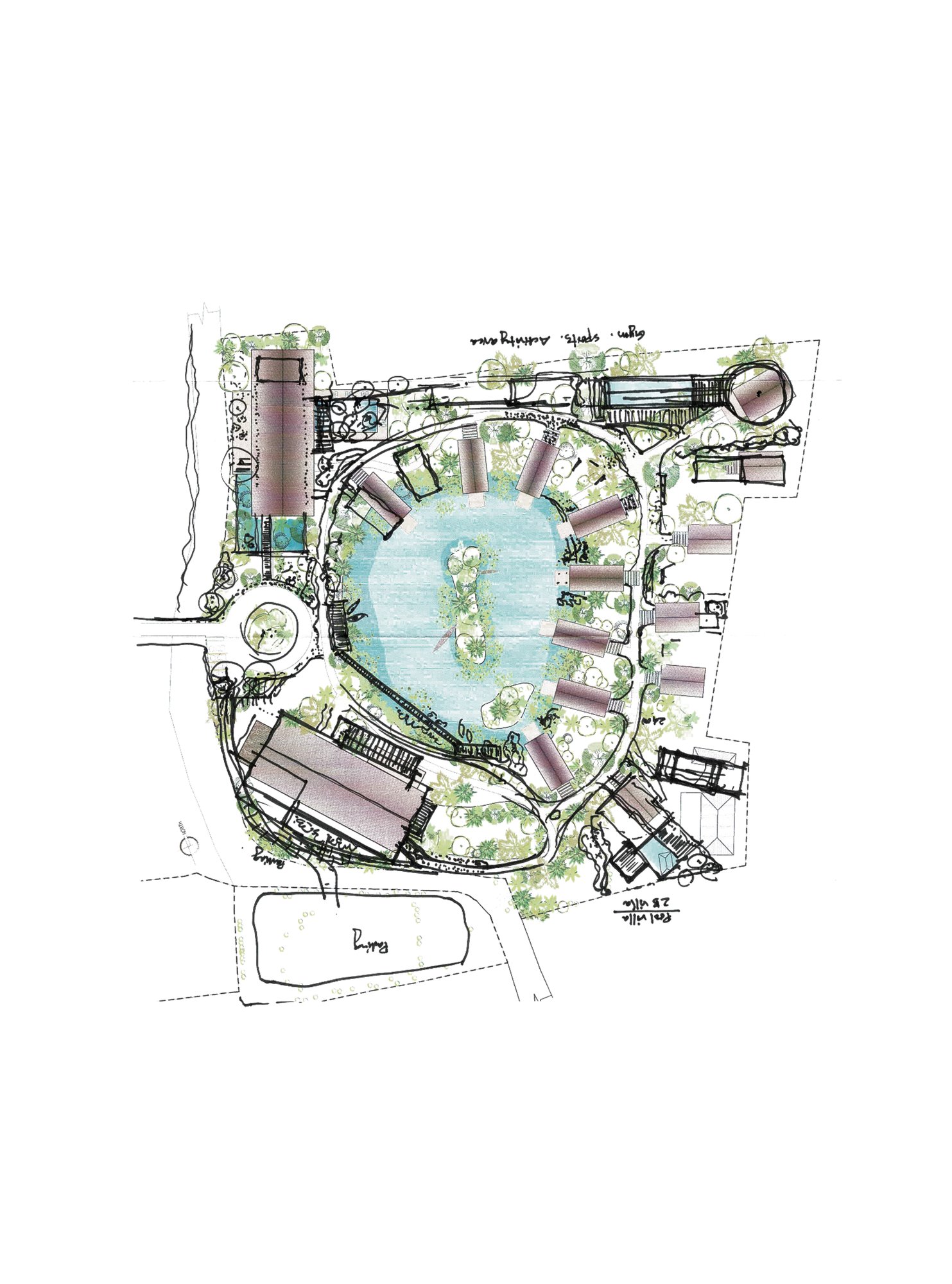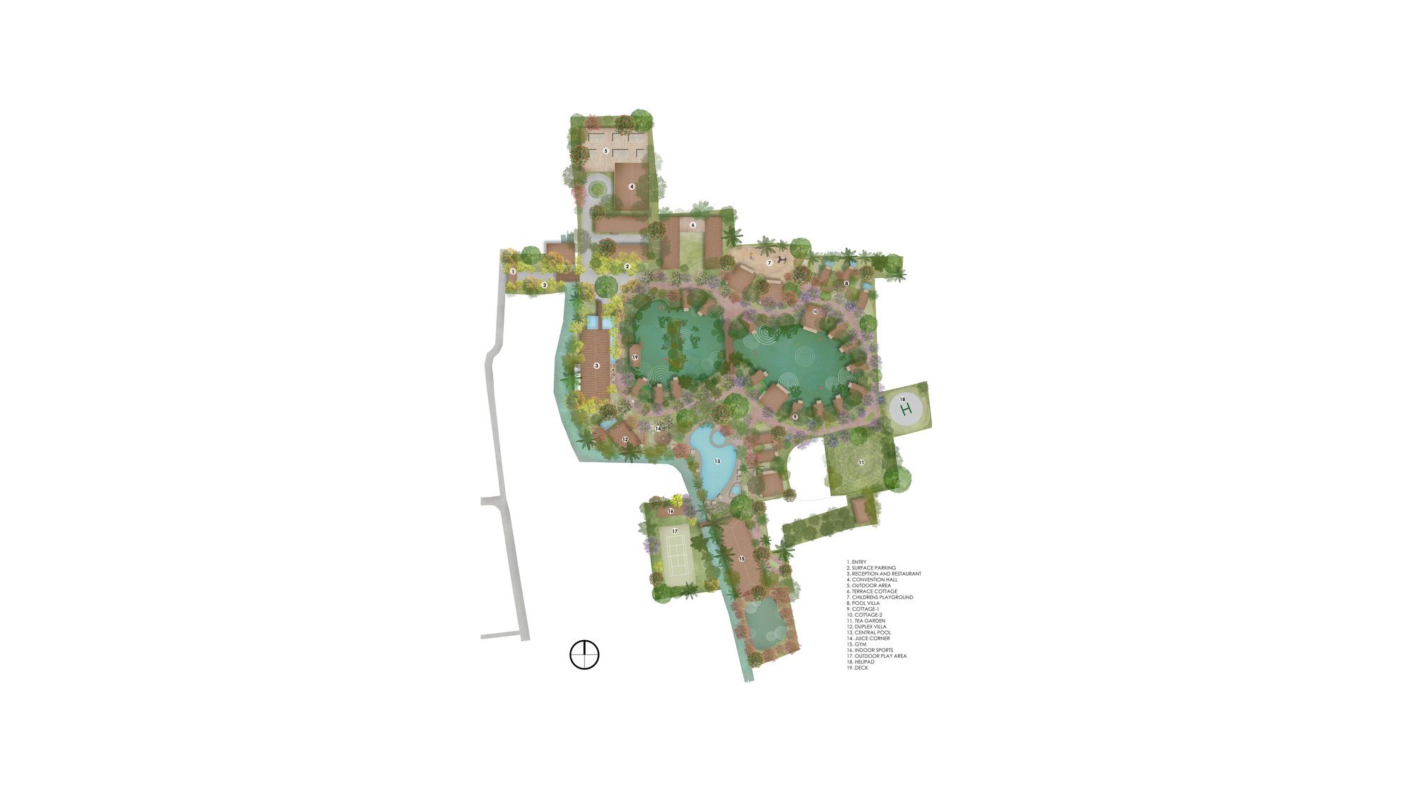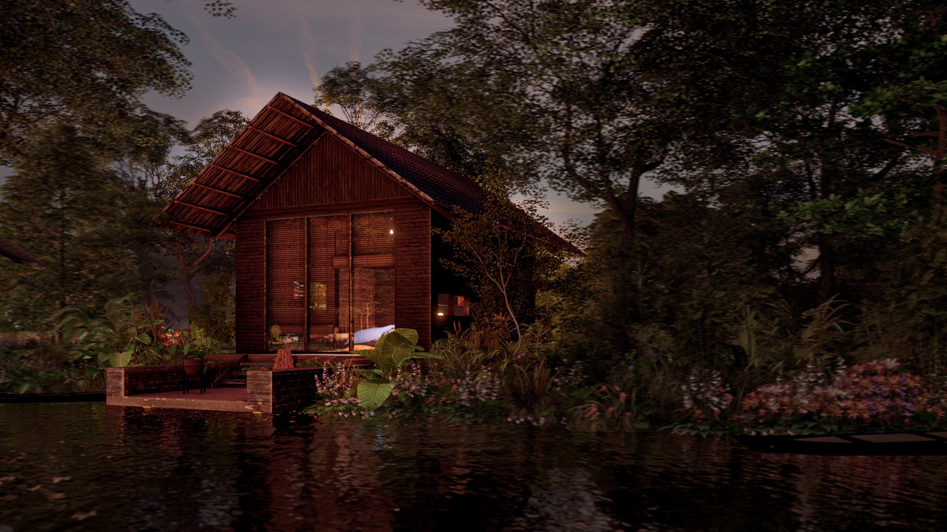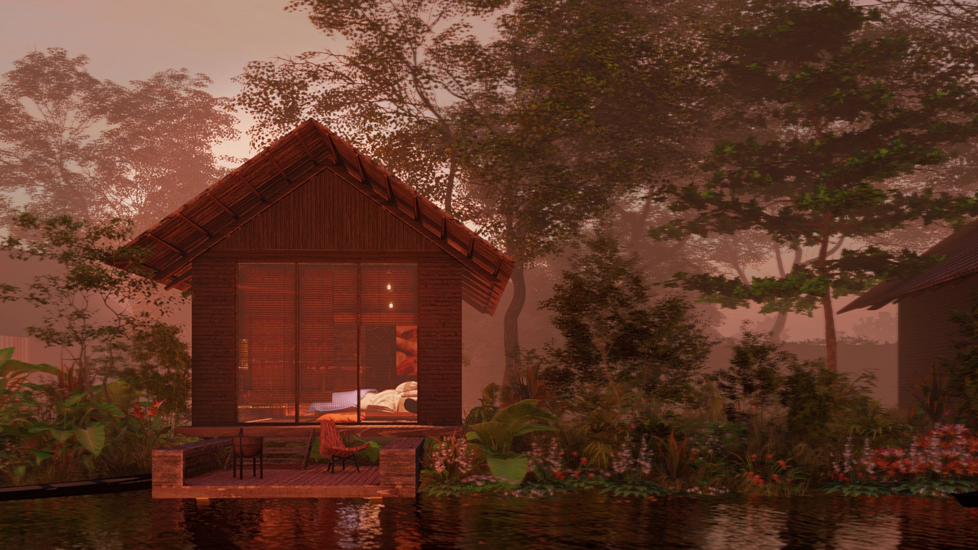The cottages appear to rest lightly within the landscape, allowing the terrain and vegetation to flow naturally around them. Their pitched roofs and simple, vernacular forms suggest a warm, intimate retreat experience structures designed not to dominate the environment but to coexist with it. Clustered along the gently curving edge of the lake, the cottages offer uninterrupted views of the water, with trees scattered organically between them to provide shade, privacy, and a sense of immersion in nature. These cottages form a peaceful refuge where guests can enjoy the calm of the water, the rustling of trees, and the embrace of nature.