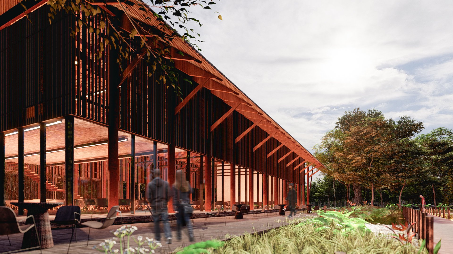 The structure itself feels light and transparent, with slender supports and an extended roofline that frames the view while sheltering the transitional spaces beneath.