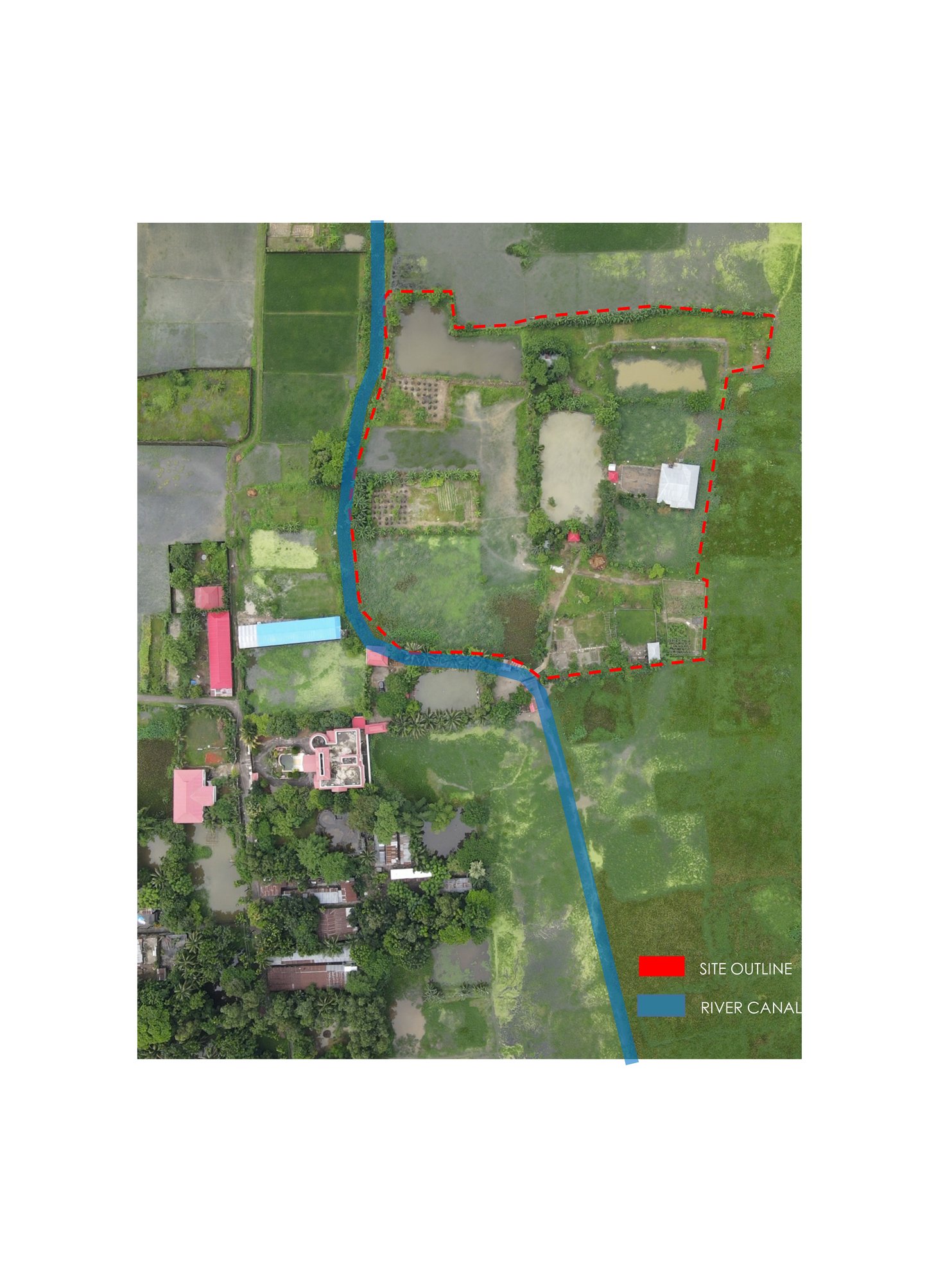The resort site located adjacent to a canal. The site is surrounded by dense greenery and water bodies. The canal provides a scenic natural boundary creating a tranquil setting for visitors. The resort is well integrated into the surrounding green and wetland environment, maintaining a balance between built-up areas and natural features.