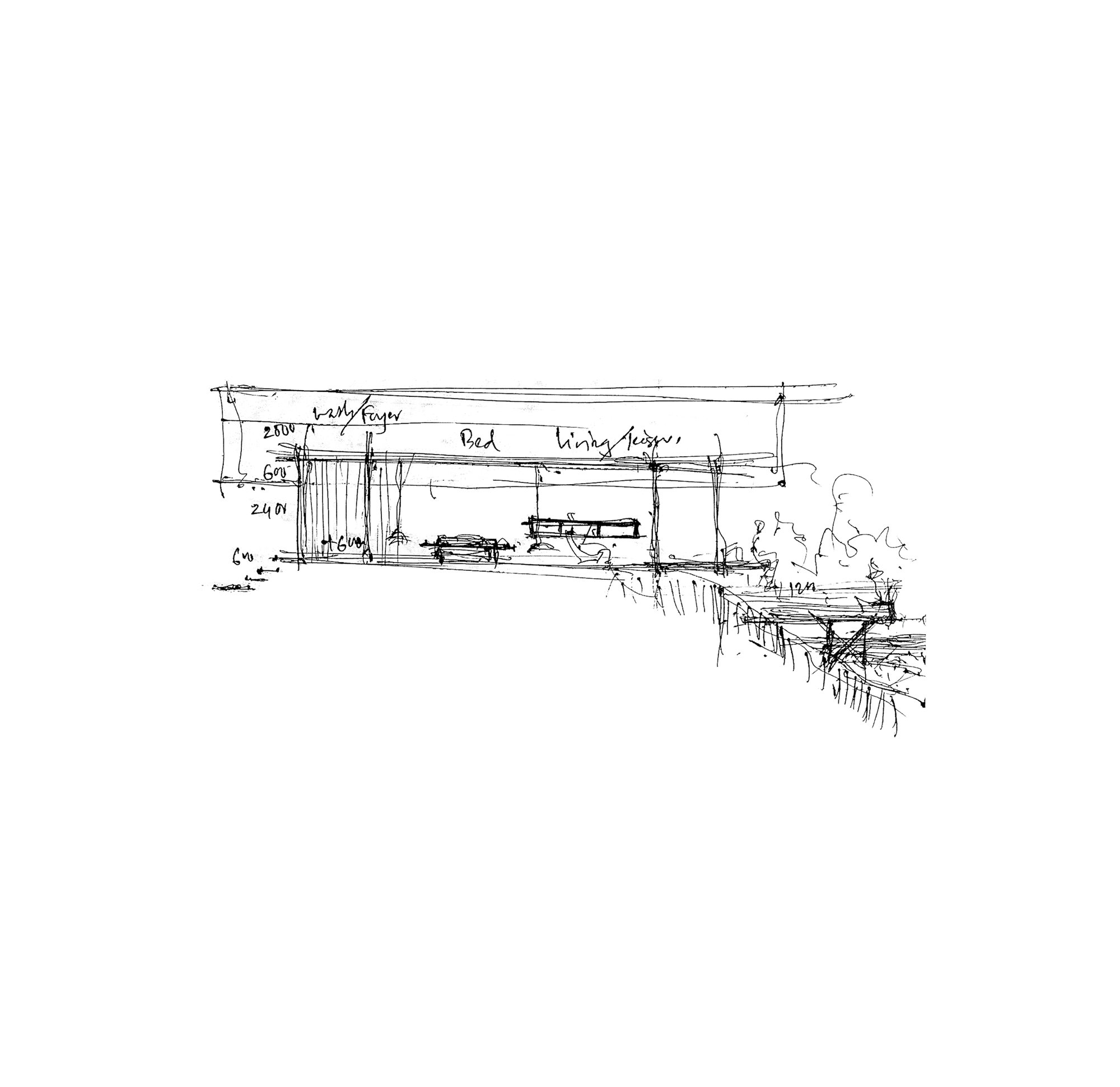 The interior zones seem to unfold in layers an indoor living or sleeping area transitioning into a semi-open verandah or lounge, and finally to an open deck that reaches out toward the water’s edge. This gradual shift from enclosed to open space creates a seamless connection between the cottage and its surroundings, inviting guests to move closer to nature without abrupt boundaries.