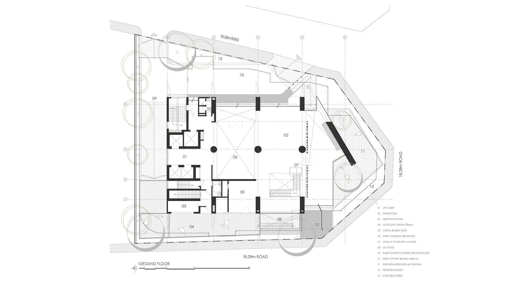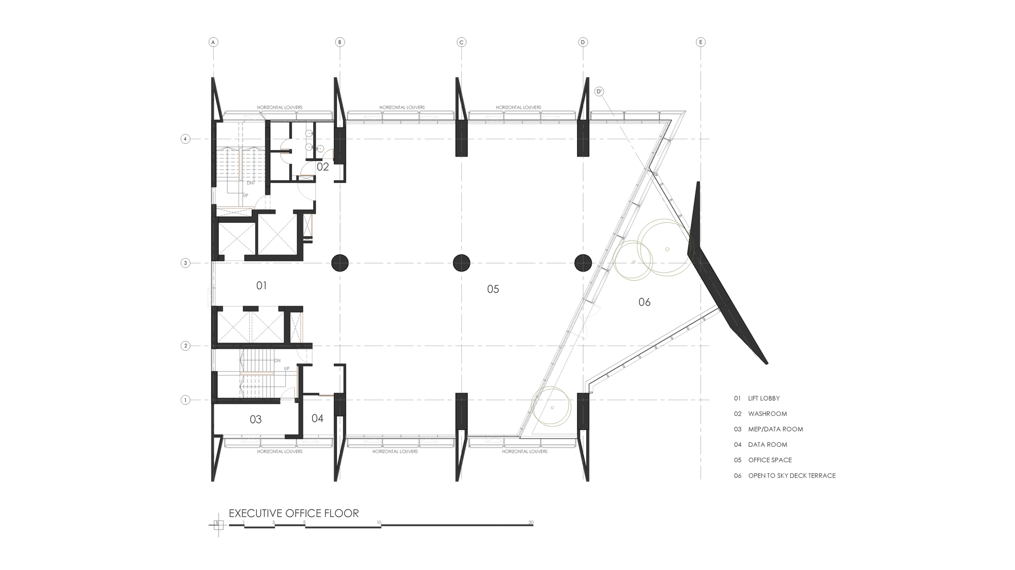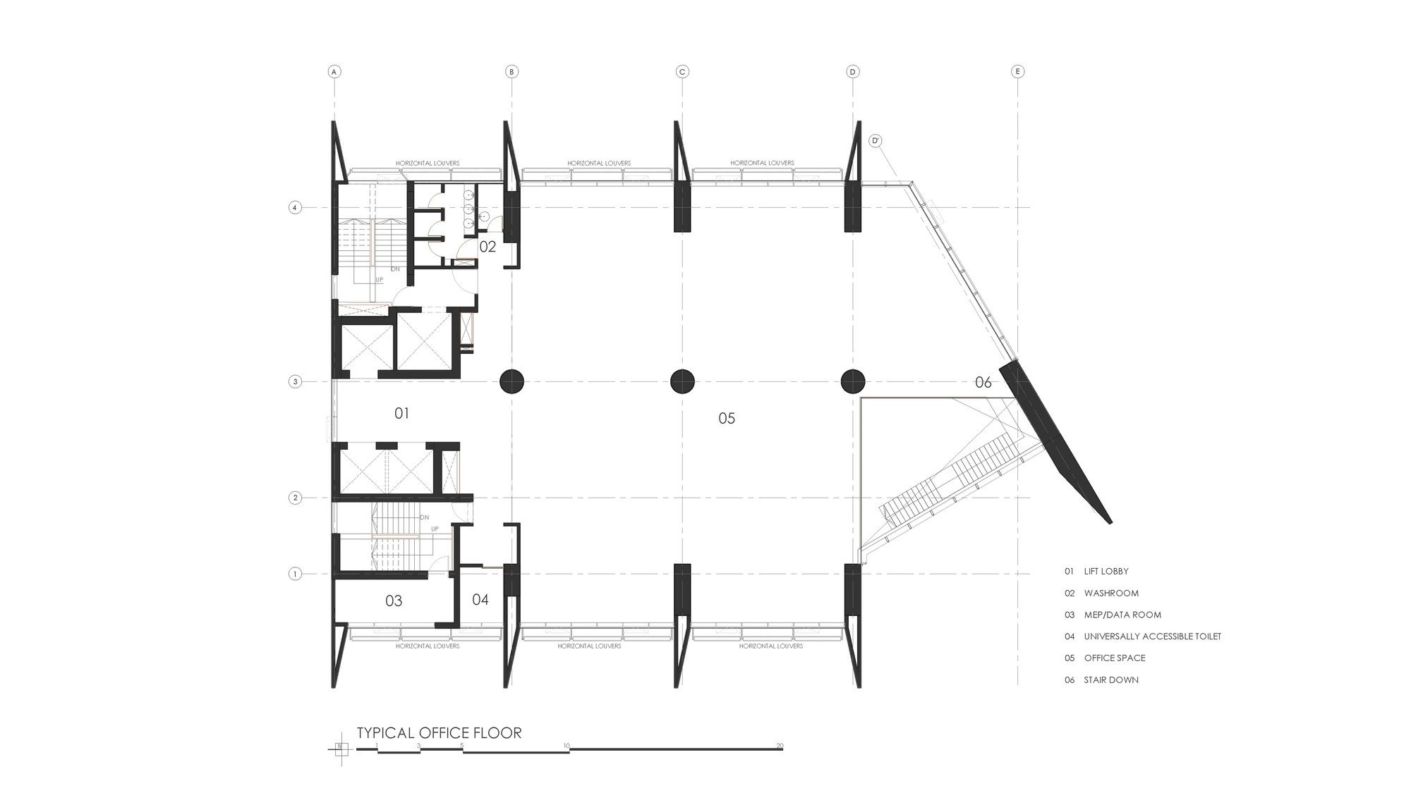 The interior space of the building is envisioned with clean and connected open floor accommodating the core at north of the site ensuring abundant flow of natural light through the spaces.