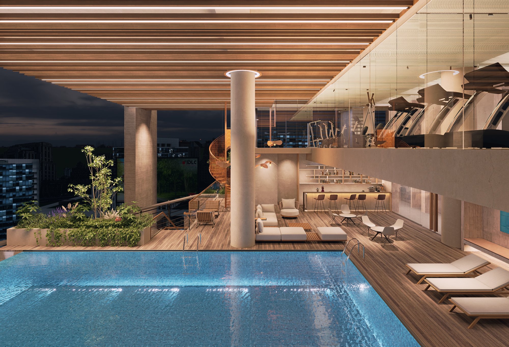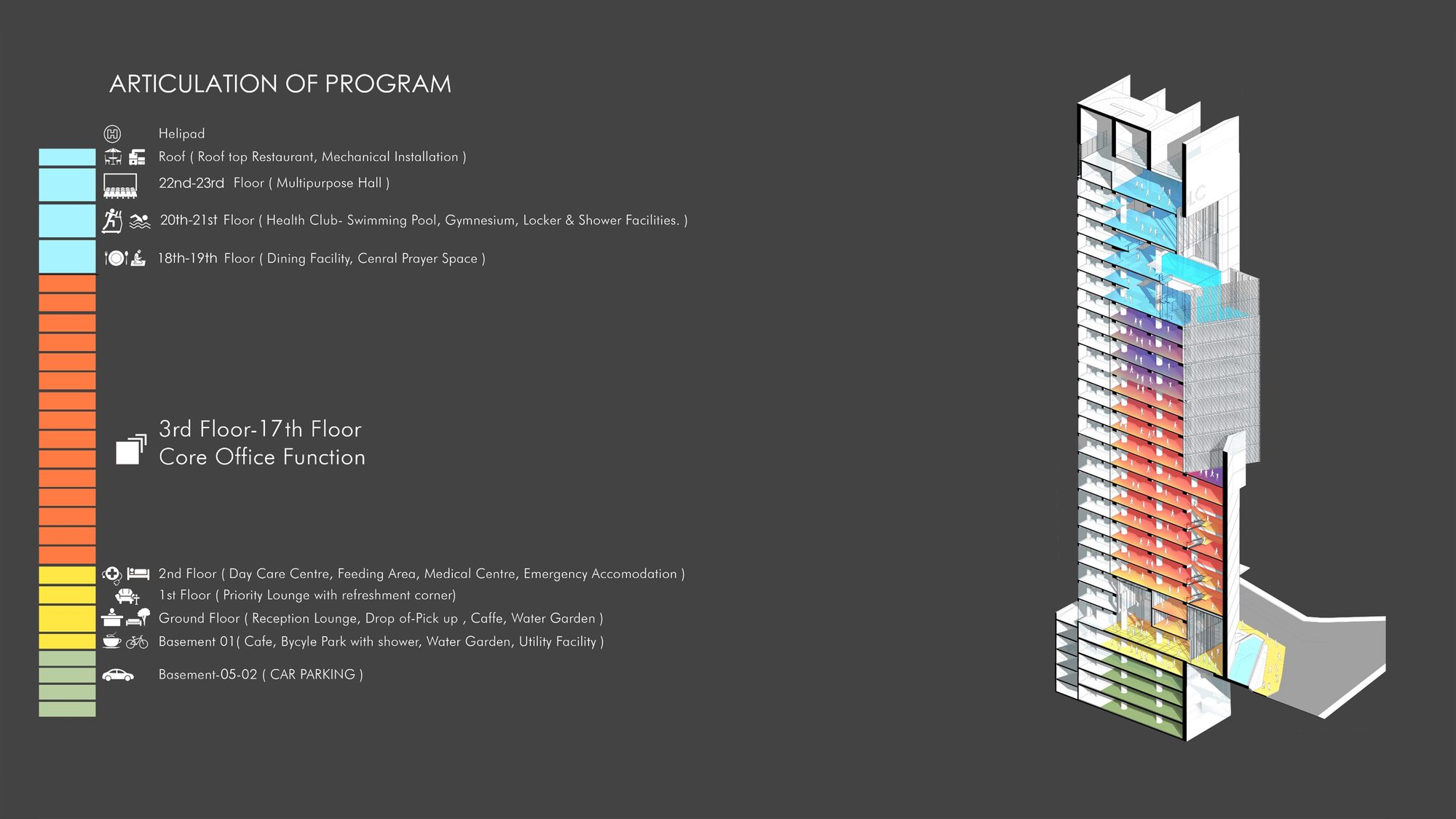 At the upper tiers, the tower evolves beyond the workplace into a social and cultural horizon in the sky. Here, dining halls, prayer spaces, a gymnasium, swimming pool, and multipurpose venues are strategically placed to command sweeping views of the city and Hatirjheel. These amenities are not just recreational add-ons; they are integral to the idea of a connected vertical campus. By elevating spaces of gathering, reflection, and wellness to the skyline, the building fosters a shared social atmosphere above the city, where community and culture thrive alongside function. The result is a headquarters that transcends the image of a corporate icon — it becomes a symbol of openness, vitality, and urban connection.