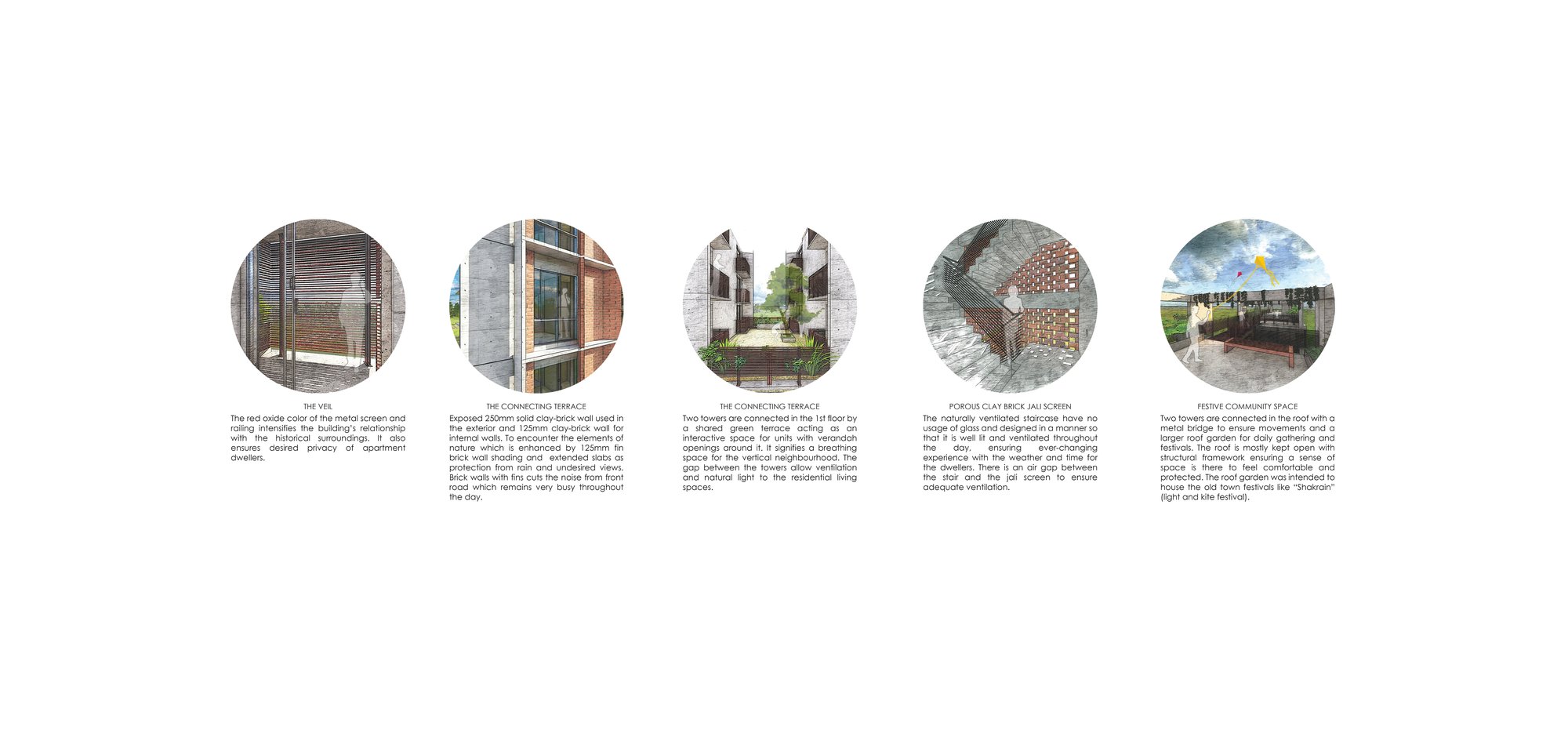 Connecting the building with the tradition and history was crucial and it became one of the major guiding force to create a strong architectural statement in the neighborhood, as well as responds to the present needs of the project to uphold the living standard in various aspects. Carefully chosen materials like exposed clay-brick, exposed as-cast concrete and usage of MS, less use of glass and less exposure of glass, makes the building very much in harmony with the specific urban setting.