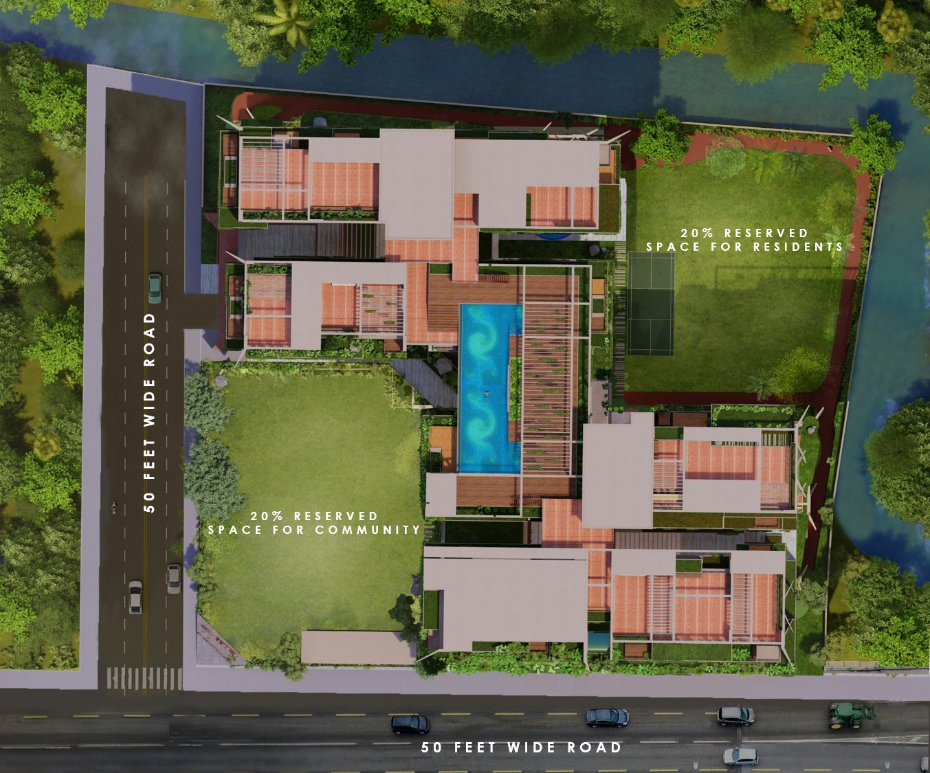 Initiated with full compliance to the Detailed Area Plan (DAP), the project stands as the first-generation Block Development model within its context. The site enjoys a rare condition lake edges on two sides and roads on the remaining two. Leveraging this exceptional potential, the design introduces two primary courtyards the Lakeyard along the lake-facing edge and the Front Yard on the opposite side. These two voids structure the entire spatial strategy, around which the functional mass is organized.