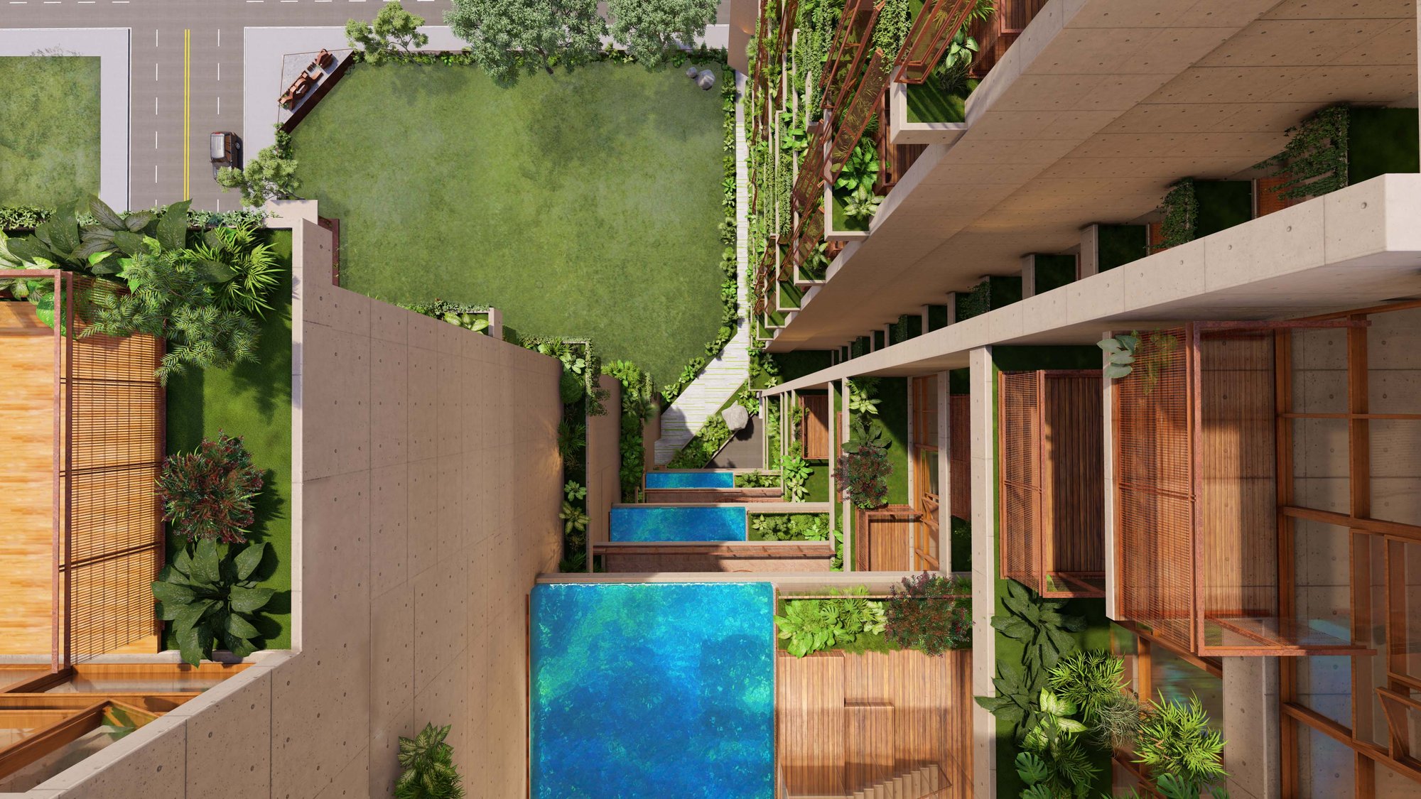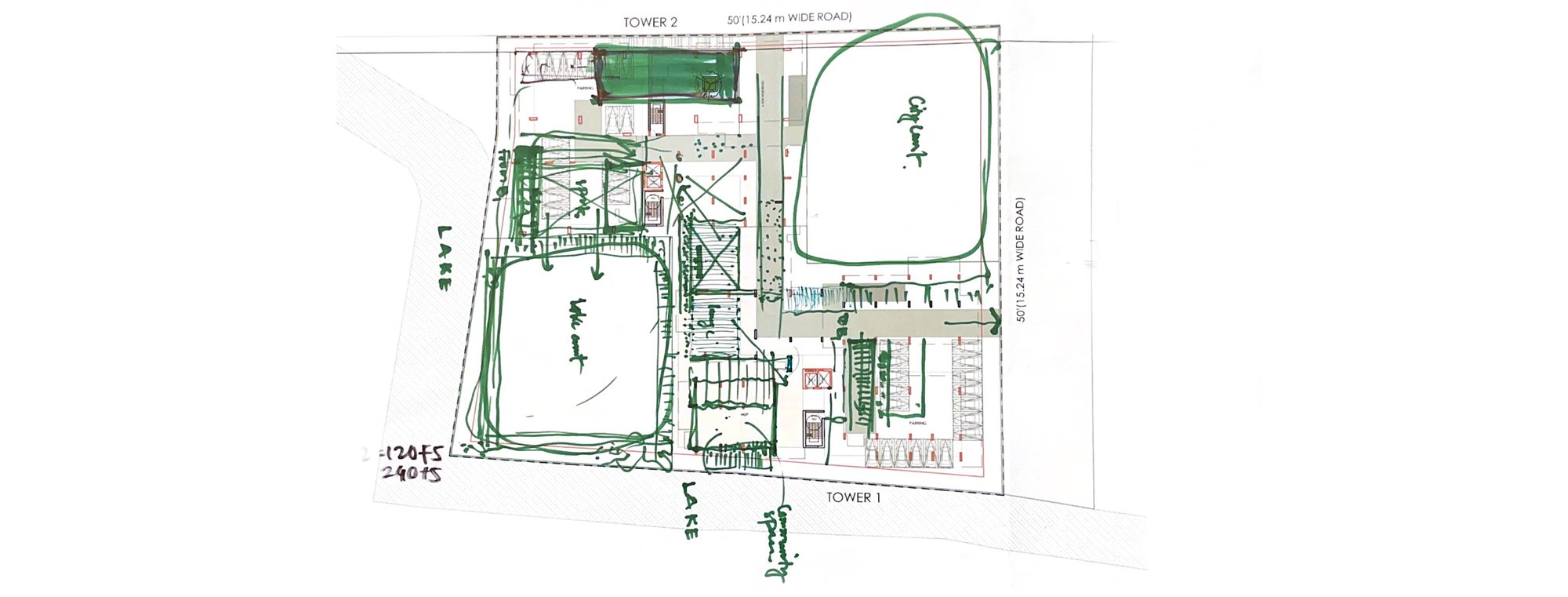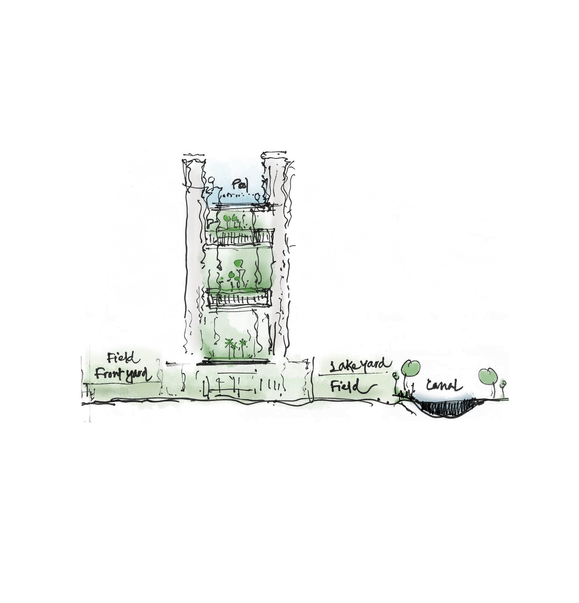 The built form is articulated as two interrelated towers, wrapping around the Lakeyard and Front Yard in a dynamic, puzzle-like arrangement. The planning remains simple in its clarity yet rich in spatial complexity, ensuring efficiency while creating diverse experiential layers. This configuration allows abundant natural light, cross ventilation, and vertically cascading green layers of greenery to permeate the building, forming the foundation of its green-wrapped facade.