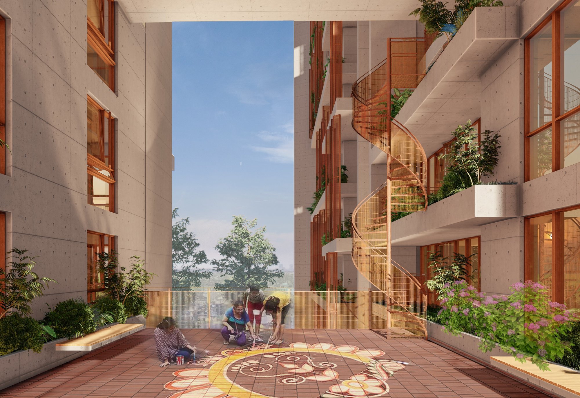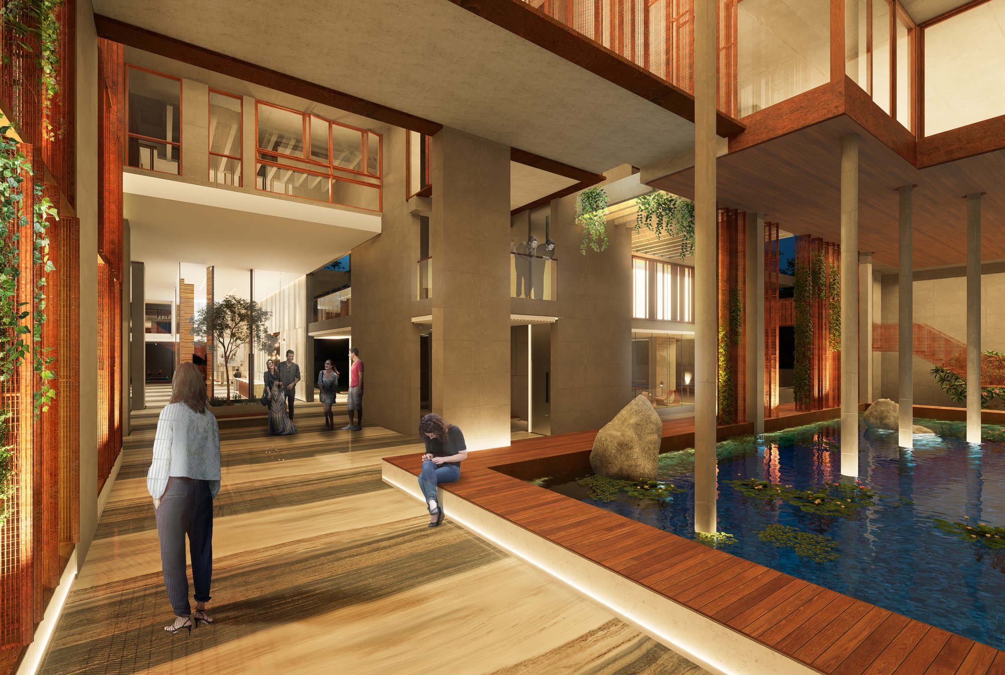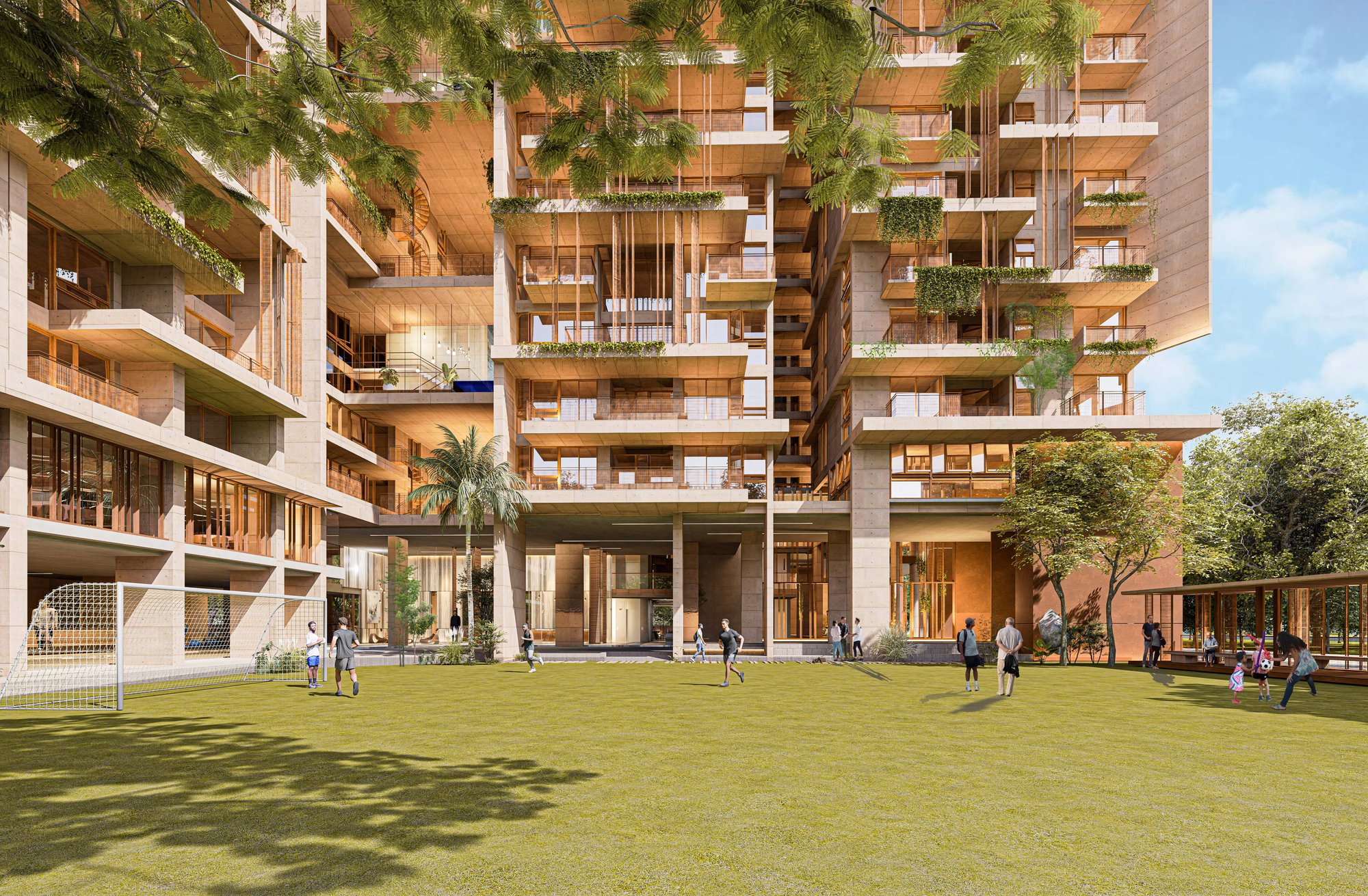 The built form is articulated as two interrelated towers, wrapping around the Lakeyard and Front Yard in a dynamic, puzzle-like arrangement. The planning remains simple in its clarity yet rich in spatial complexity, ensuring efficiency while creating diverse experiential layers. This configuration allows abundant natural light, cross ventilation, and vertically cascading green layers of greenery to permeate the building, forming the foundation of its green-wrapped facade.