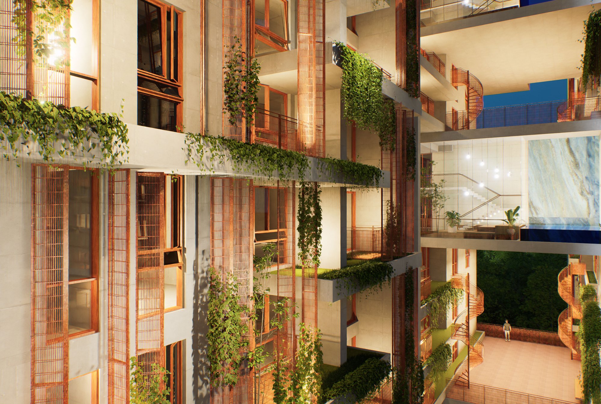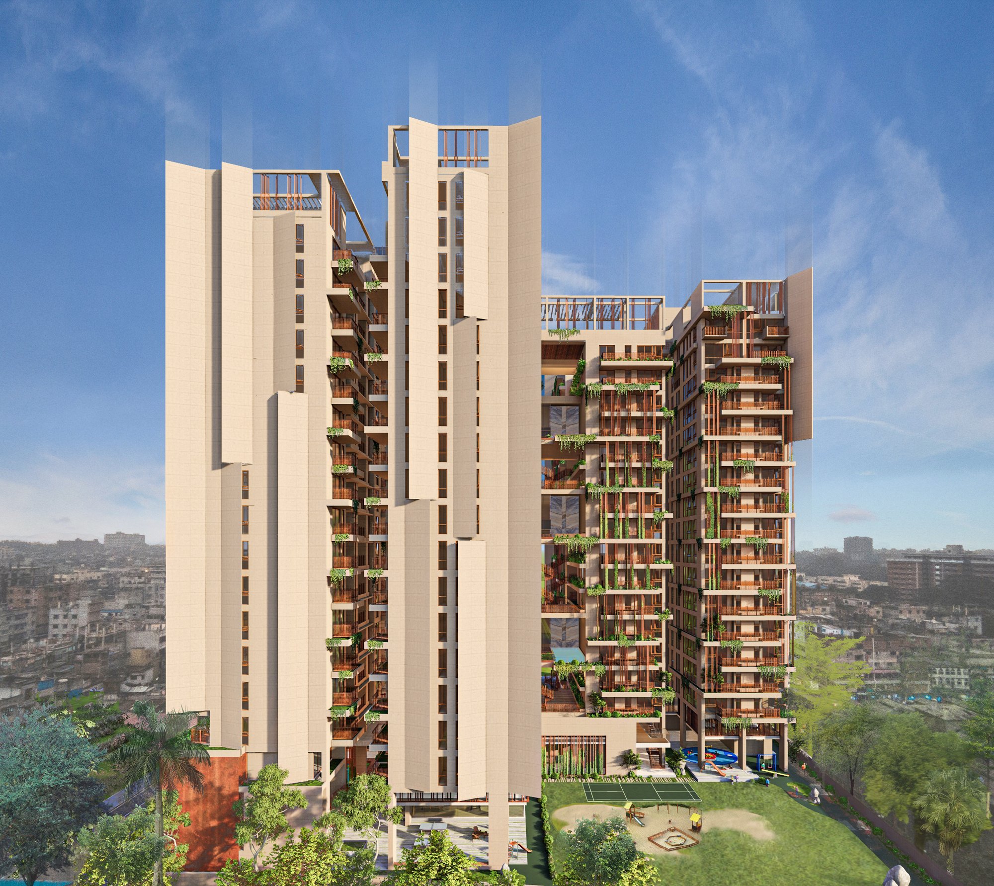 To achieve the green wrapped envelope, the exterior incorporates metal perforated grating (welded mesh), selected specifically for Dhaka’s climatic conditions. The towers are connected at selected levels through shared amenity and community spaces, while remaining separated where privacy and security are necessary
