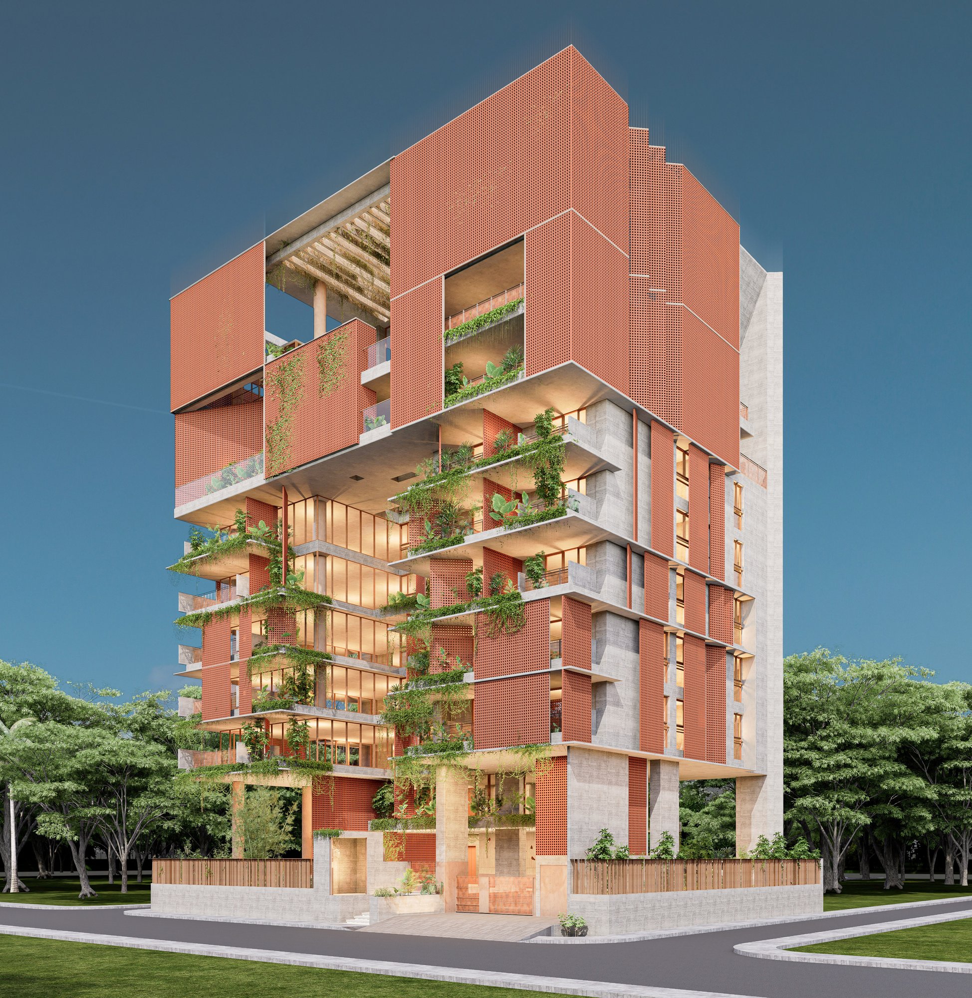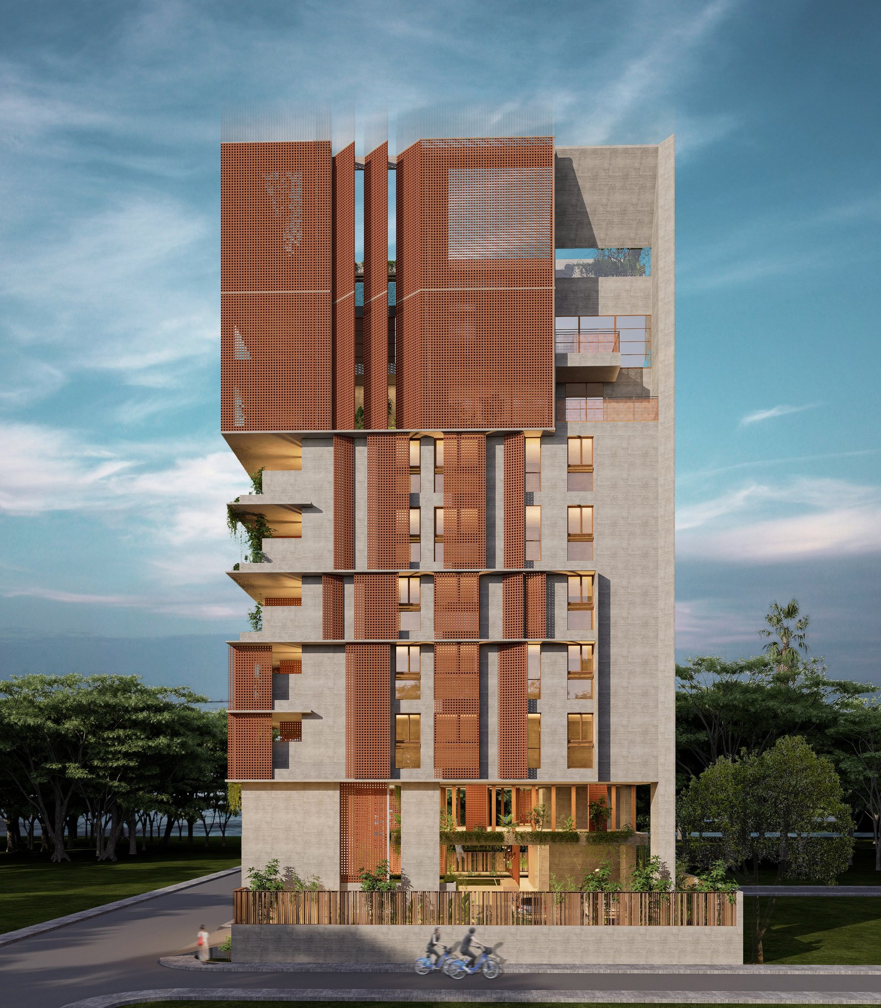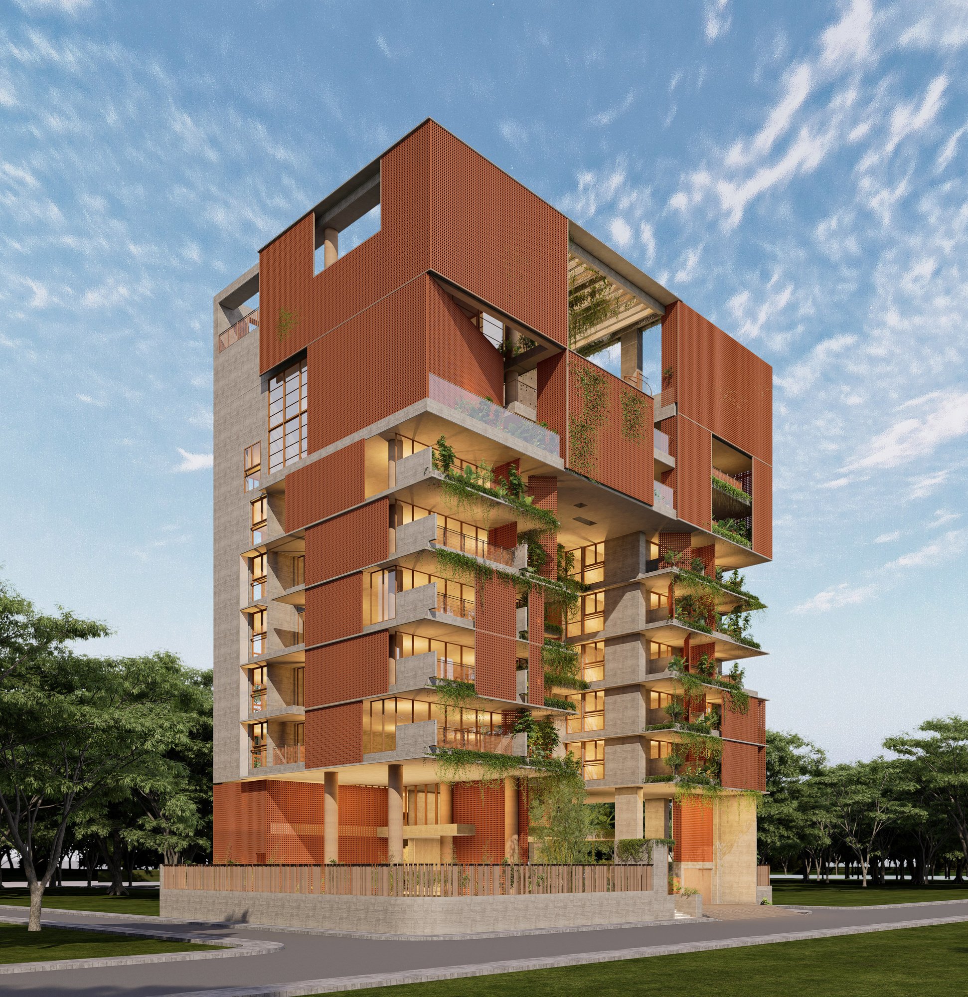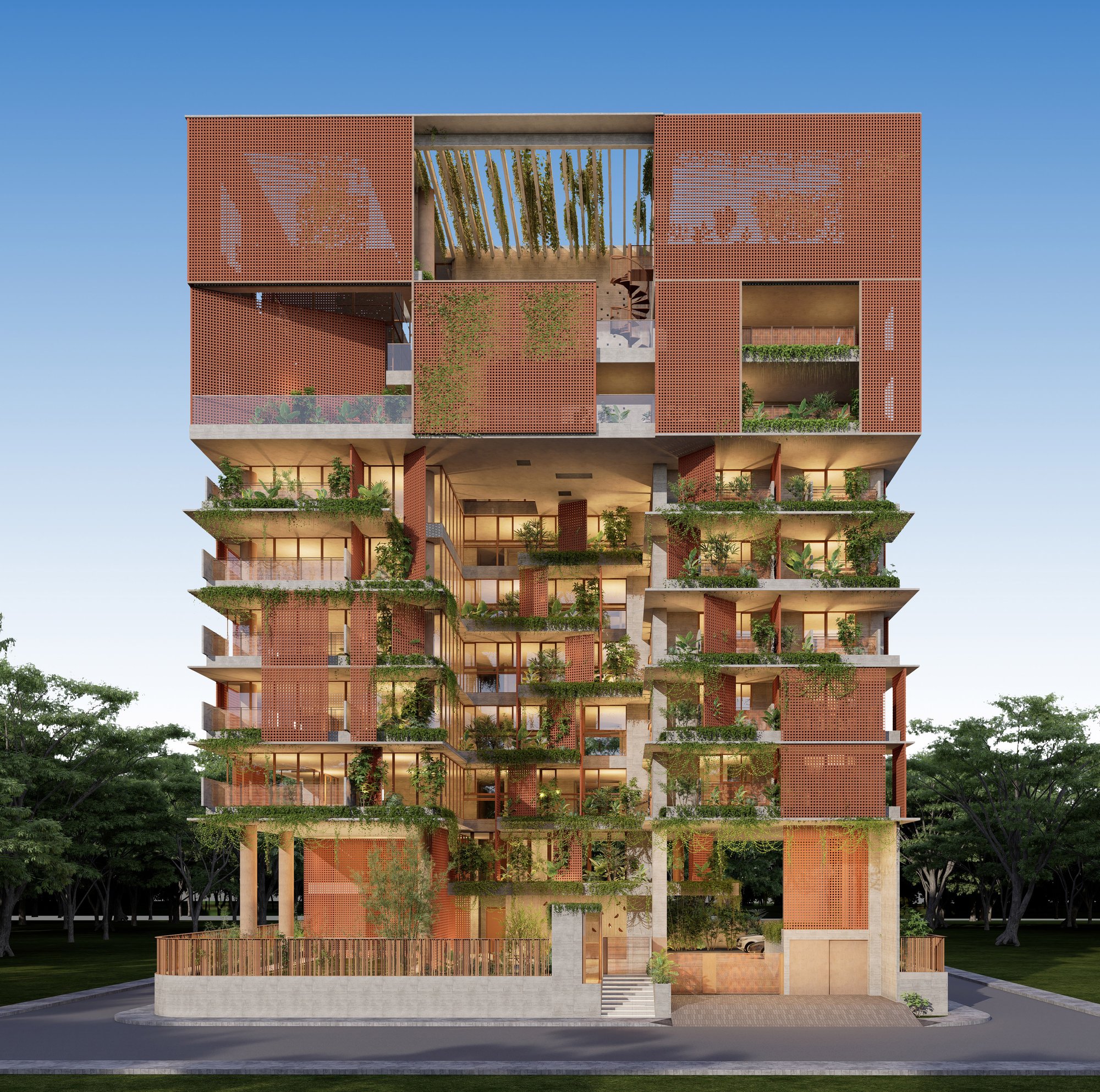 The massing is sculpted to maximize natural ventilation, encourage cross-breezes, and allow unobstructed views from the upper family levels where the owners will reside. Layered balconies, green verandas, and carefully designed cutouts soften the verticality, grounding the structure in a dialogue between built form and nature.