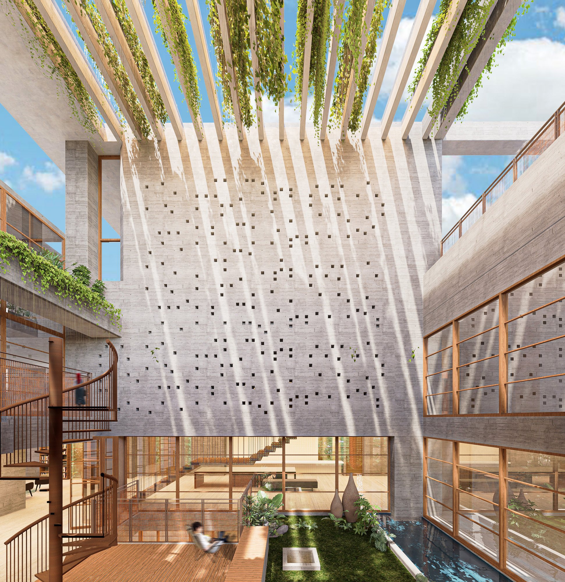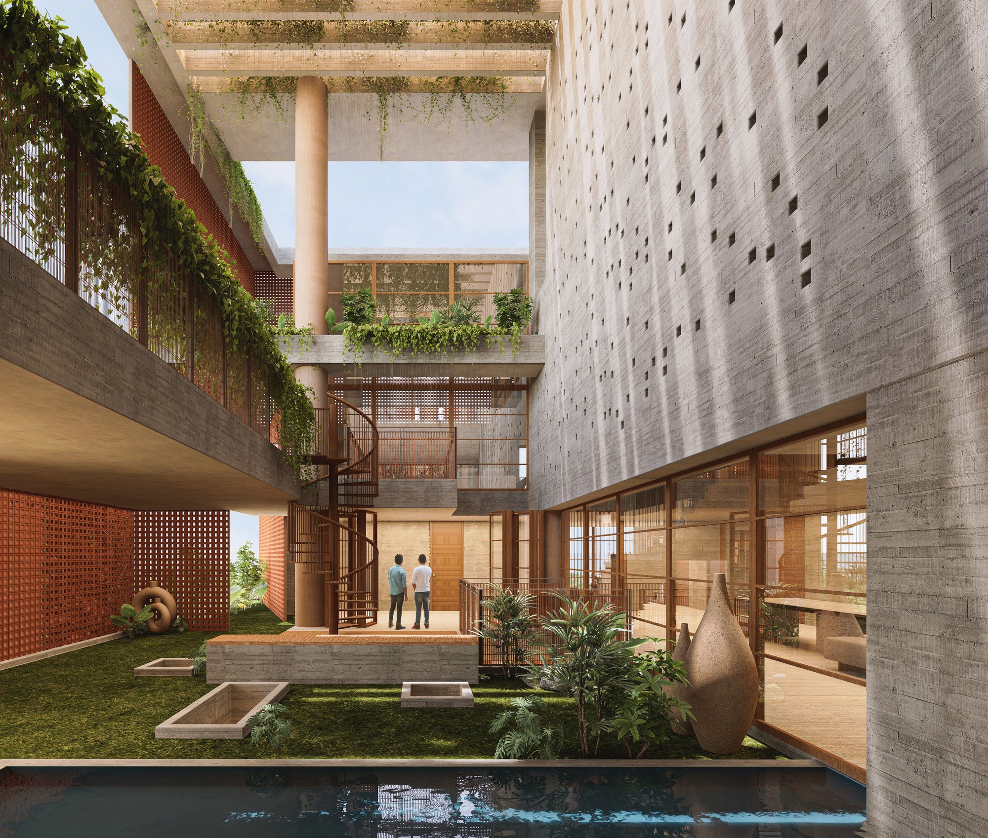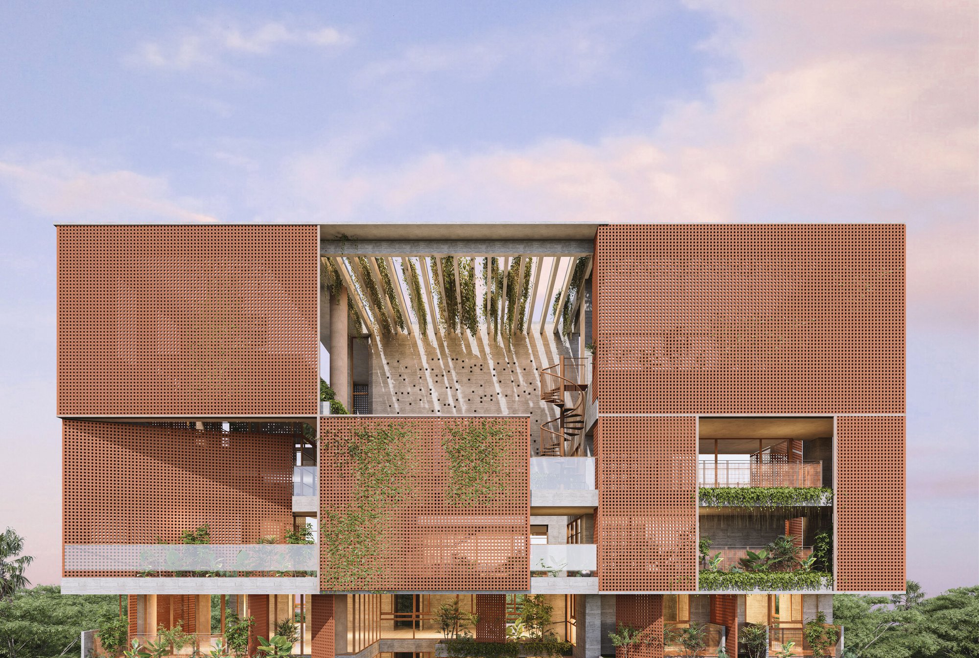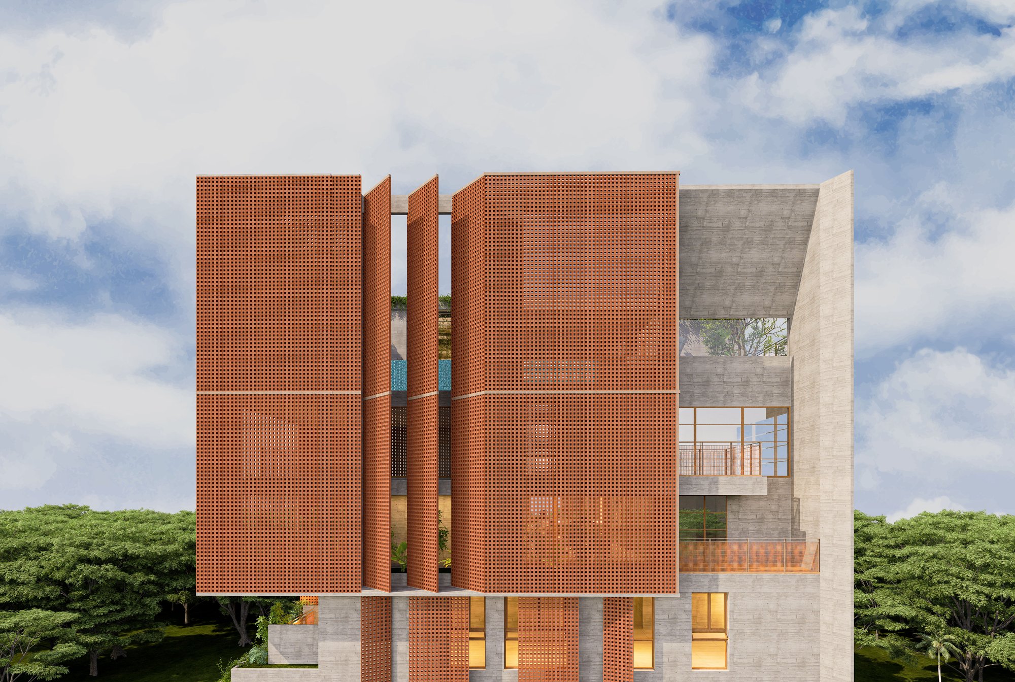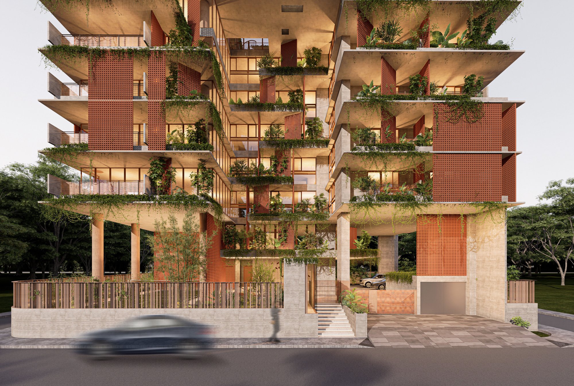 The massing is sculpted to maximize natural ventilation, encourage cross-breezes, and allow unobstructed views from the upper family levels where the owners will reside. Layered balconies, green verandas, and carefully designed cutouts soften the verticality, grounding the structure in a dialogue between built form and nature.