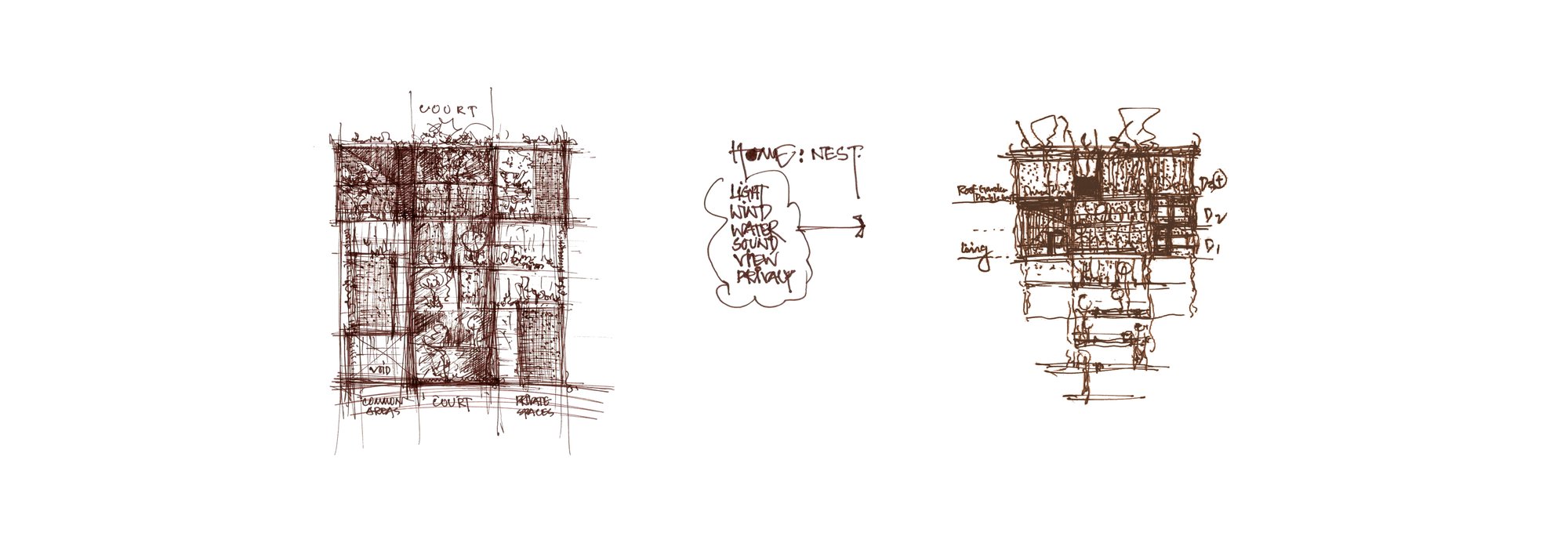A defining feature of the project is the central green loft and vertical void—conceptualized as the “Nest”, both symbolic and functional. This carved-out space anchors the entire building, offering a serene inner world where light, wind, water, sound, and greenery coexist. It restores the essence of the courtyard typology familiar in traditional Dhaka residences. The massing is sculpted to maximize natural ventilation, encourage cross-breezes, and allow unobstructed views from the upper family levels where the owners will reside. Layered balconies, green verandas, and carefully designed cutouts soften the verticality, grounding the structure in a dialogue between built form and nature.